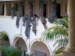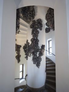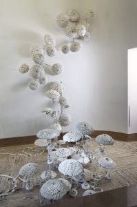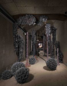 Tanja Smeets transformeert ruimtes met haar sculpturen, die uit alle hoeken van de kamer komen gekropen, over vloeren verspreid liggen of van plafonds en wanden naar beneden hangen. Het zijn een soort landschappen, bestaande uit een mengeling van bijvoorbeeld grijs vilt in sierlijke patronen, gebreide structuren van wol, en daar tussendoor bollen van samengevoegde bladvangers – plastic frames met pinnetjes die ervoor zorgen dat er geen blad in je regenpijp terecht komt. Tanja’s mooie maar ook onheilspellende figuren lijken onstuitbaar uit te dijen, en ogen zowel organisch als kunstmatig.