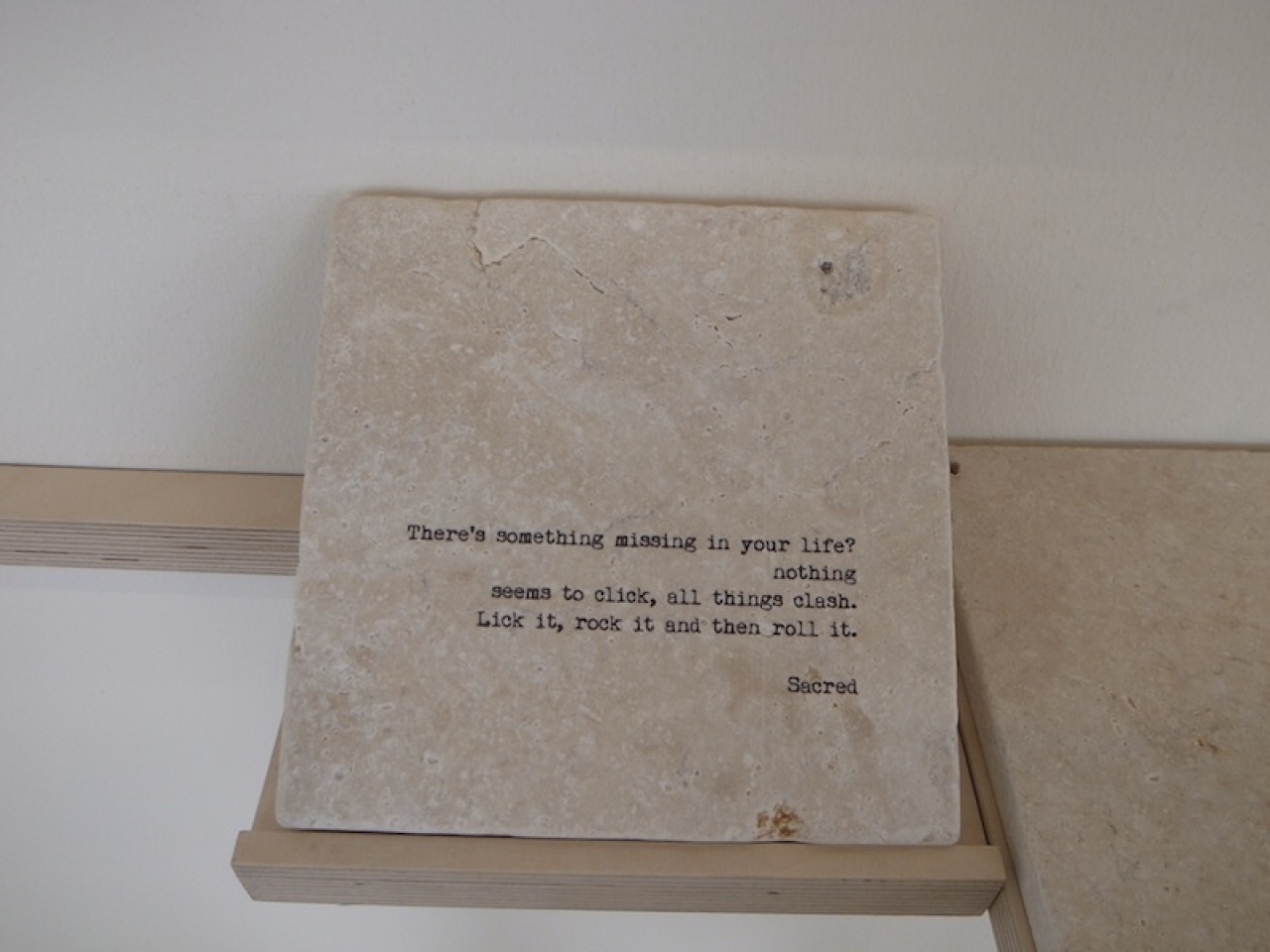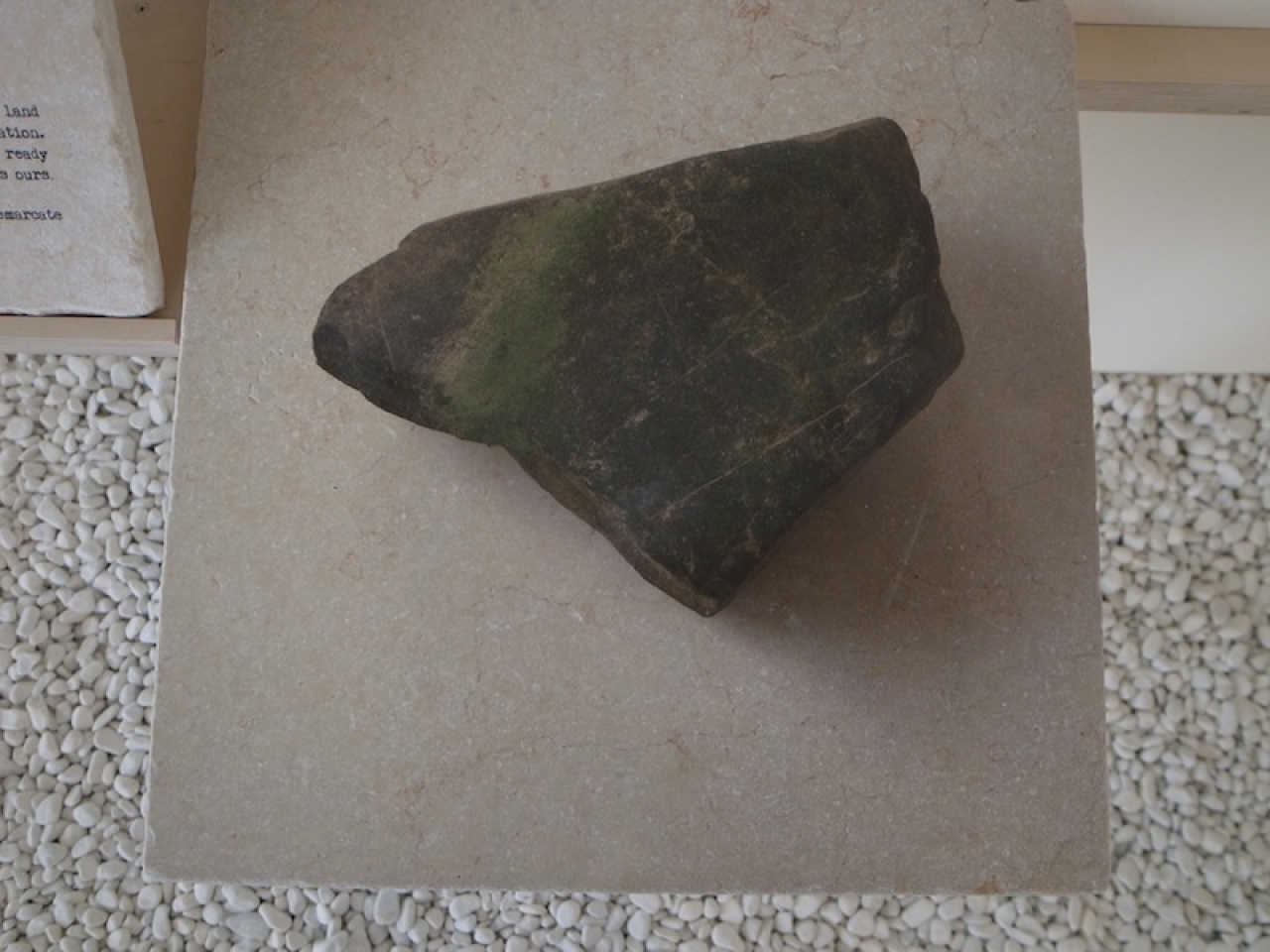 De installatie is getiteld Taste of a Stone en was voor het eerst te zien op de tentoonstelling Make Yourself at Home in de Kunsthal Charlottenburg, in Kopenhagen in 2010. Zes houten tafels stonden rondom tegen de muren op de houten vloer, ernaast was een ruimte gevuld met zwarte gravel waar Epifyten groeiden op rotsstenen. Deze planten hebben geen wortels nodig om zich te voeden, ze kunnen vrijwel overal hun thuis maken.