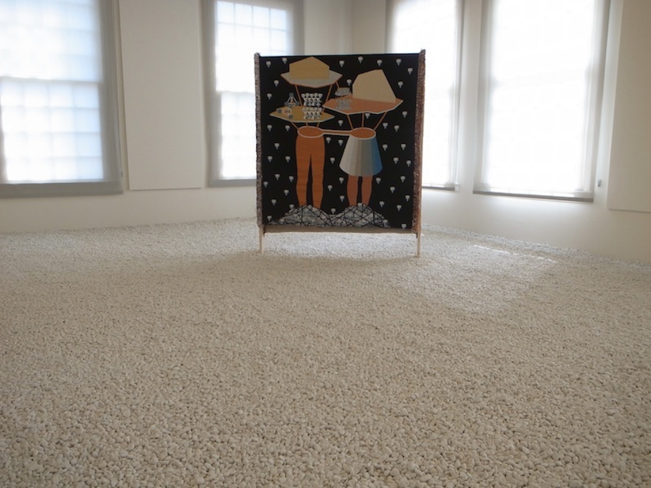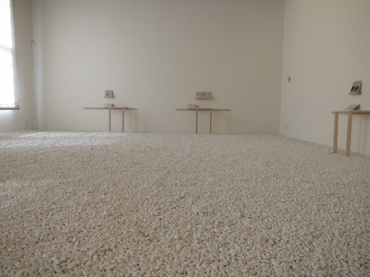De tentoonstellingsruimte is getransformeerd tot een binnenplaats in een museum. Natuurlijk doet de zaal denken aan een zen tuin uit Japan, en borrelen vanuit zen allerlei associaties over de betekenis van deze steentje omhoog. De gedachte die mij het meeste aanspreekt is ‘dat de geest flexibel is en dit is wat we moeten oefenen’, daaruit volgt dat de interpretatie van een zen tuin open is, gewoon wat jij er zelf van maakt. De stenen knisperen onder je schoenen, iedere stap is hoorbaar en hoe je lichaam manoeuvreert door de ruimte is opeens een ervaring van de zintuigen.