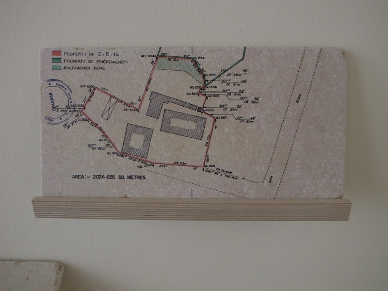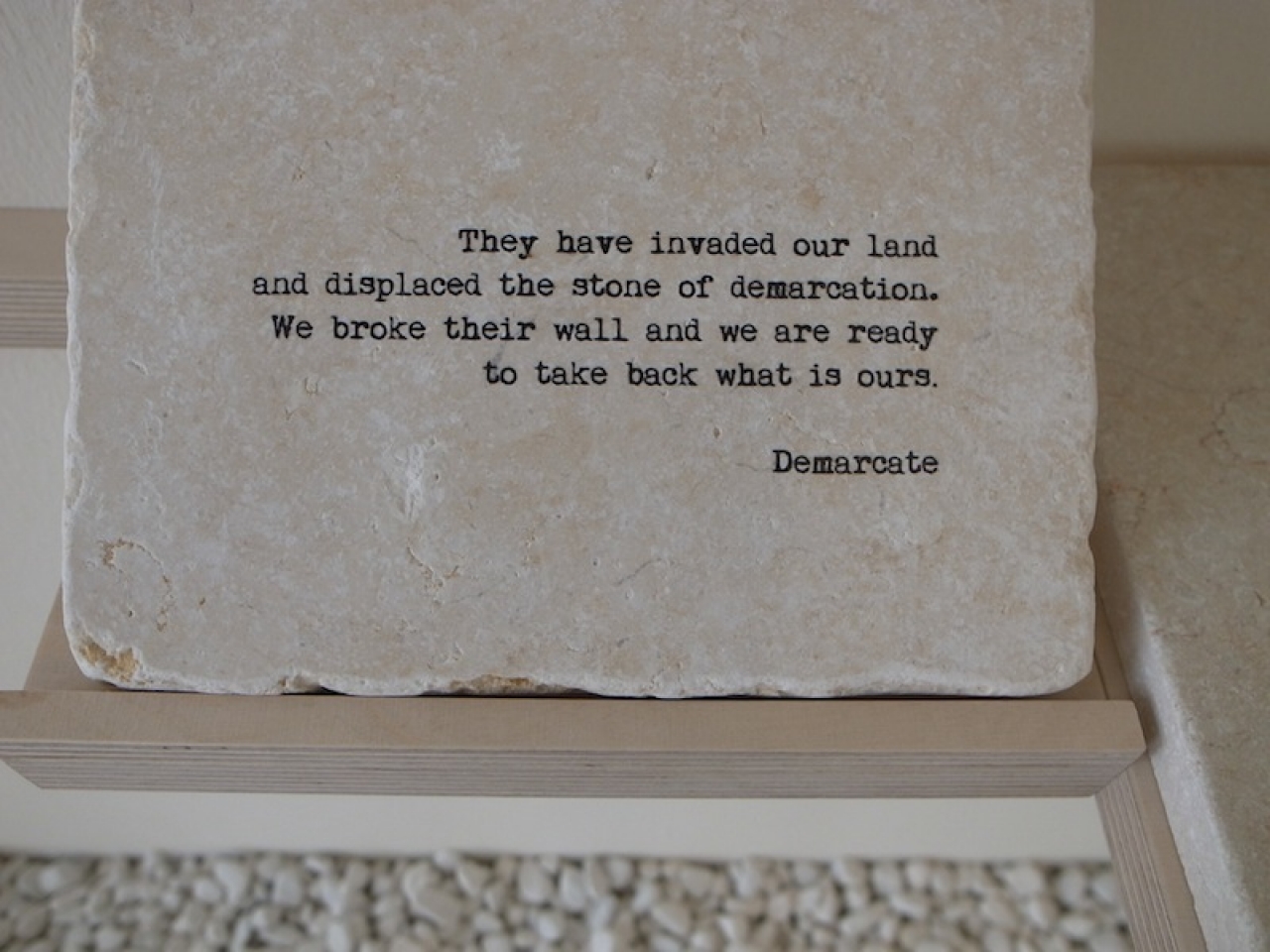 Zoals het land van haar vader in Nigeria, waarvan een deel door de buren werd geannexeerd. Wat doe je dan, vechten om je eigen stukje land terug te krijgen of laat je het gaan? De plattegrond van het familie-eigendom staat afgebeeld op een van de platte stenen boven een tafel. De steen als afgrenzing van het land, ‘Demarcate’.