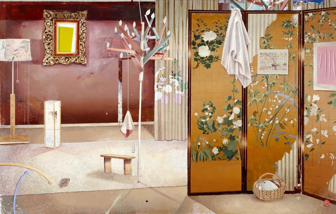 In het eerste decennium van deze eeuw verwierf Matthias Weischer bekendheid met zijn collageachtige interieurs vol speelse, surrealistische elementen en verwijzingen naar meesterwerken uit de kunstgeschiedenis. Zo hangen er op dit Chinese kamerscherm reproducties van een tekening van Vincent van Gogh en een schilderij van Lucio Fontana.