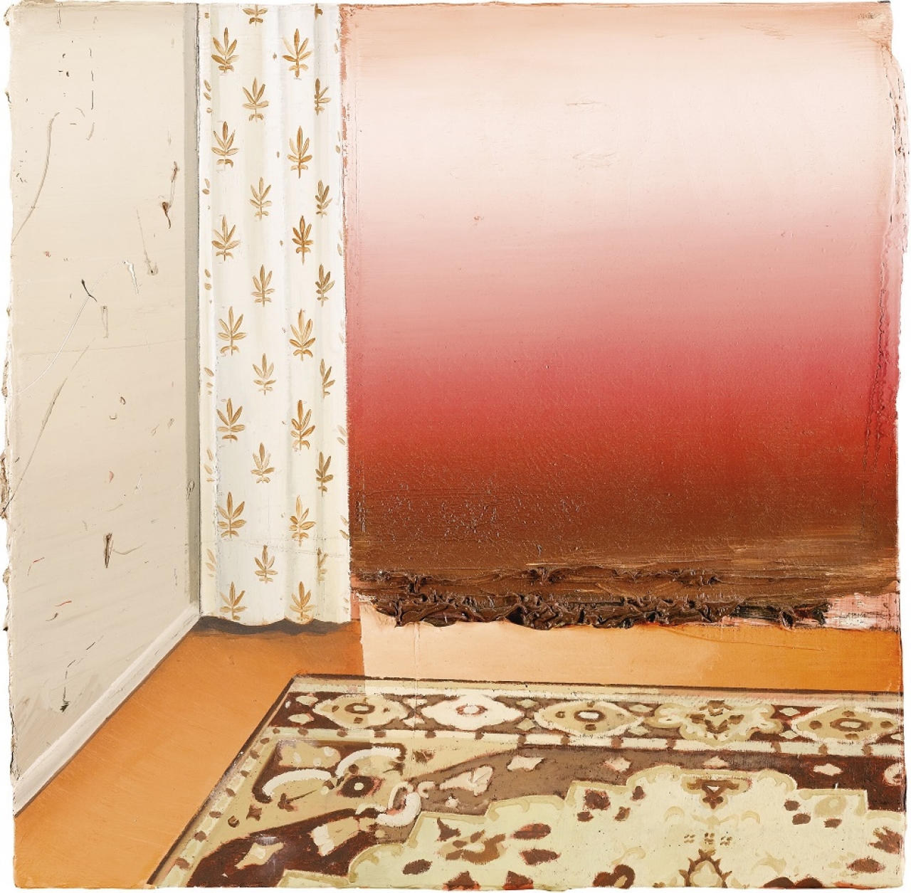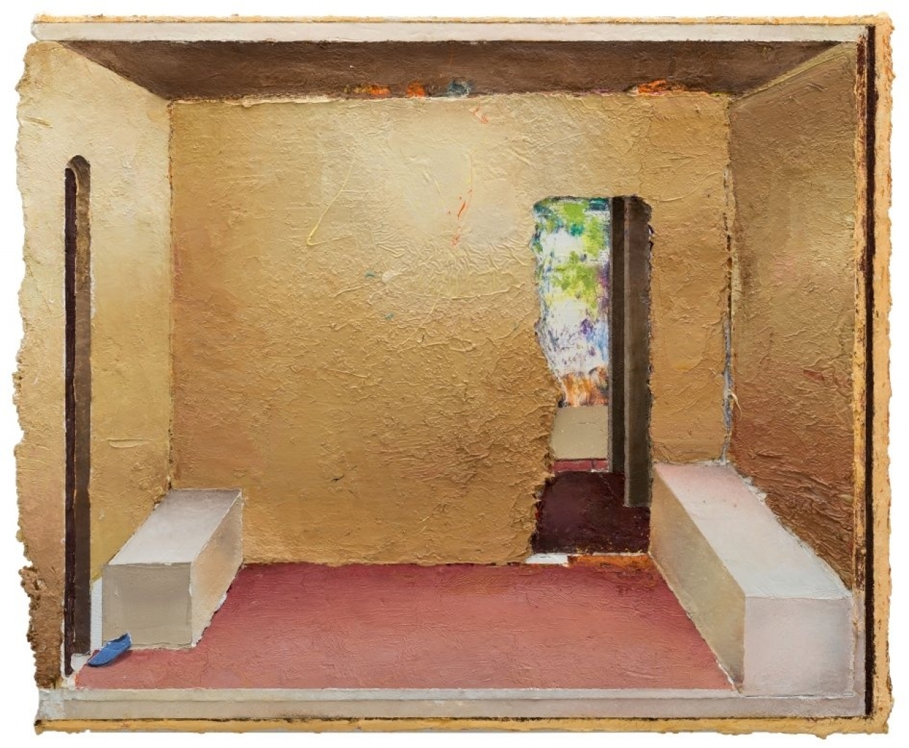 ‘Carré is geïnspireerd op een foto van een fresco uit Pompeii,’ aldus Weischer. Ongeveer in deze periode begon hij schilderijen te produceren in tweetallen, waaraan hij gelijktijdig werkt. Het biedt de mogelijkheid om verschillende ingrepen met elkaar te vergelijken. Momenteel hangt Weischers atelier vol kleine doekjes van kloosterachtige ruimtes, allemaal in paren van twee. Het effect van de uitstekende randen creëert hij door een dikke laag verf aan te brengen en die vervolgens, terwijl het nog nat is, naar de zijkant te schrapen. In dit schilderij wordt daardoor het effect van de doorgang aan de linkerkant versterkt. Bovendien ontstaat er een associatie met het – voor eeuwenoude fresco’s karakteristieke – afbladderen van verf.