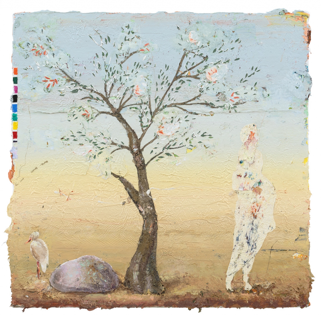 ‘Als ik grote kunst zie waarvan ik onder de indruk ben, denk ik altijd: ik wil iets soortgelijks proberen. Uiteraard eindig ik altijd met mijn eigen interpretatie, anders zou het saai worden.’ In dit doek, waarvan de titel gebaseerd is op Botticelli’s meesterwerk Primavera (‘lente’), heeft Weischer gewerkt met lieflijke pasteltinten, die de zachtheid van de lente symboliseren. De onderste laag van het schilderij bestaat echter uit onvermengde primaire kleuren, zoals die in het kleurenpalet aan de linkerkant weergegeven zijn. Op de plek van de bloesems heeft Weischer met een mesje de pastelkleurige lagen weggekrabt, zodat de felle onderlaag feestelijk doorschemert. De pose van de vrouwfiguur herinnert aan de liefdesgodin in Botticelli’s beroemdste schilderij, De geboorte van Venus.