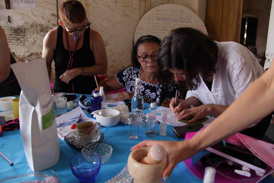 Burr Raty: Mijn onderzoek komt voort uit een interesse naar de manier waarop ons altijd over vrouwelijke organen is geleerd, en hoe we deze anders kunnen benaderen en voorstellen dan in de schoolboeken wordt gedaan. Ik leerde dat de vrouwelijke organen een ‘hypernature’ hebben die vloeistoffen kunnen produceren die net als dierlijke vloeistoffen voedzaam zijn, en die net als planten medische krachten hebben. Ik heb in de afgelopen jaren mijn eigen vloeistoffen geoogst en onderzocht in verschillende performances; zo maakte ik recent een installatie waarin ik thee maakte van mijn eigen ongesteldheidsbloed en organiseerde ik workshops waarin vrouwen om me heen verzamelden met dezelfde interesses. Uit deze bijeenkomsten werd eigenlijk de beauty kit female farm geboren: deze vrouwen zijn nu hier met mij en leren van en met mij over de manier waarop ze hun verschillende vloeistoffen kunnen oogsten en vervolgens tot schoonheidsproducten kunnen maken, en in ruil hiervoor staan zij hun ‘oogst’ aan mij af zodat ik hier mee aan de slag kan. De producten die ik hiervan maak verkoop ik. Dit handelsaspect is heel belangrijk voor mij omdat het mijn uiteindelijke doel is om te testen hoe de boerderij een zelfvoorzienend productiemodel kan worden.