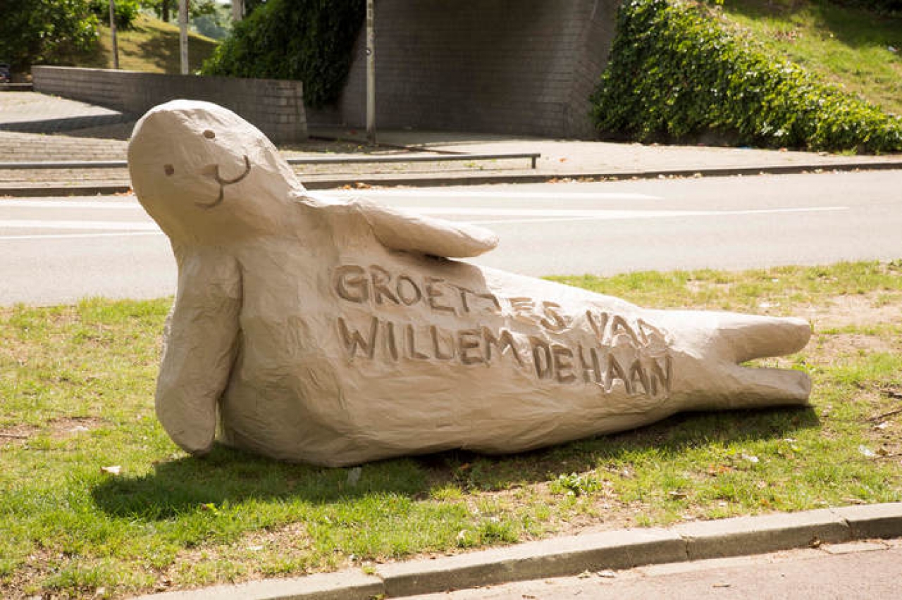 Willem de Haan believes in the value of humour. For that reason, the work he produces functions as a tribute to the funny and absurd situations he finds himself in on a daily basis. For his graduation last summer, De Haan showed twelve of these tributes on a tour through public space. At a high speed, on the back of a moped, the visitors were transported past the sculptures, paintings, prints, videos and performance. That happy seal in a partytent? Yeah, that was part of the tour as well.