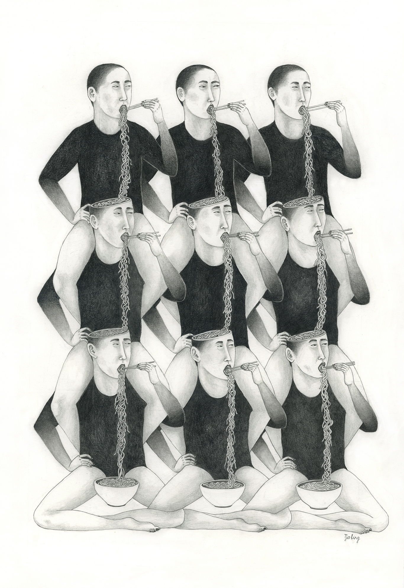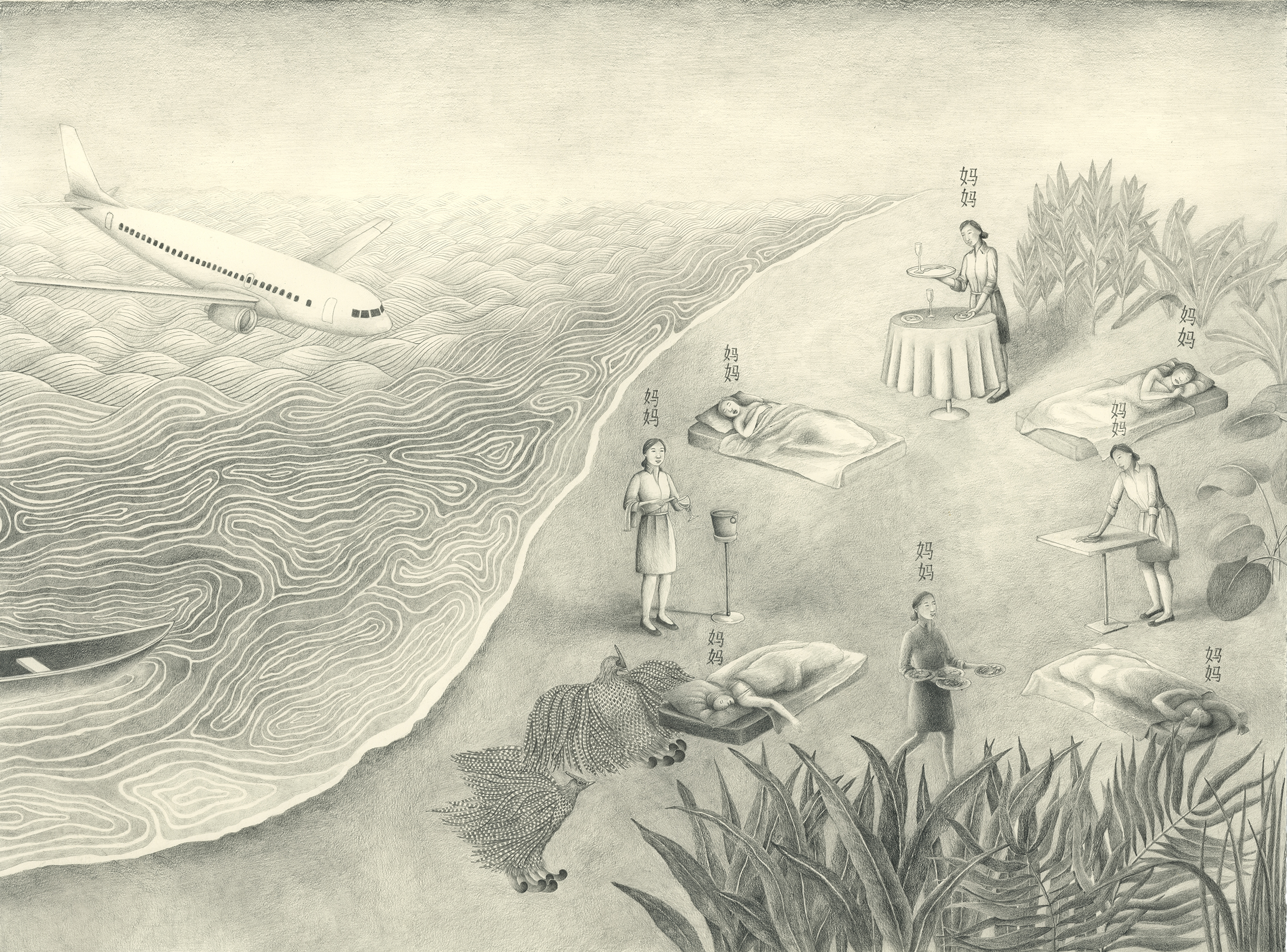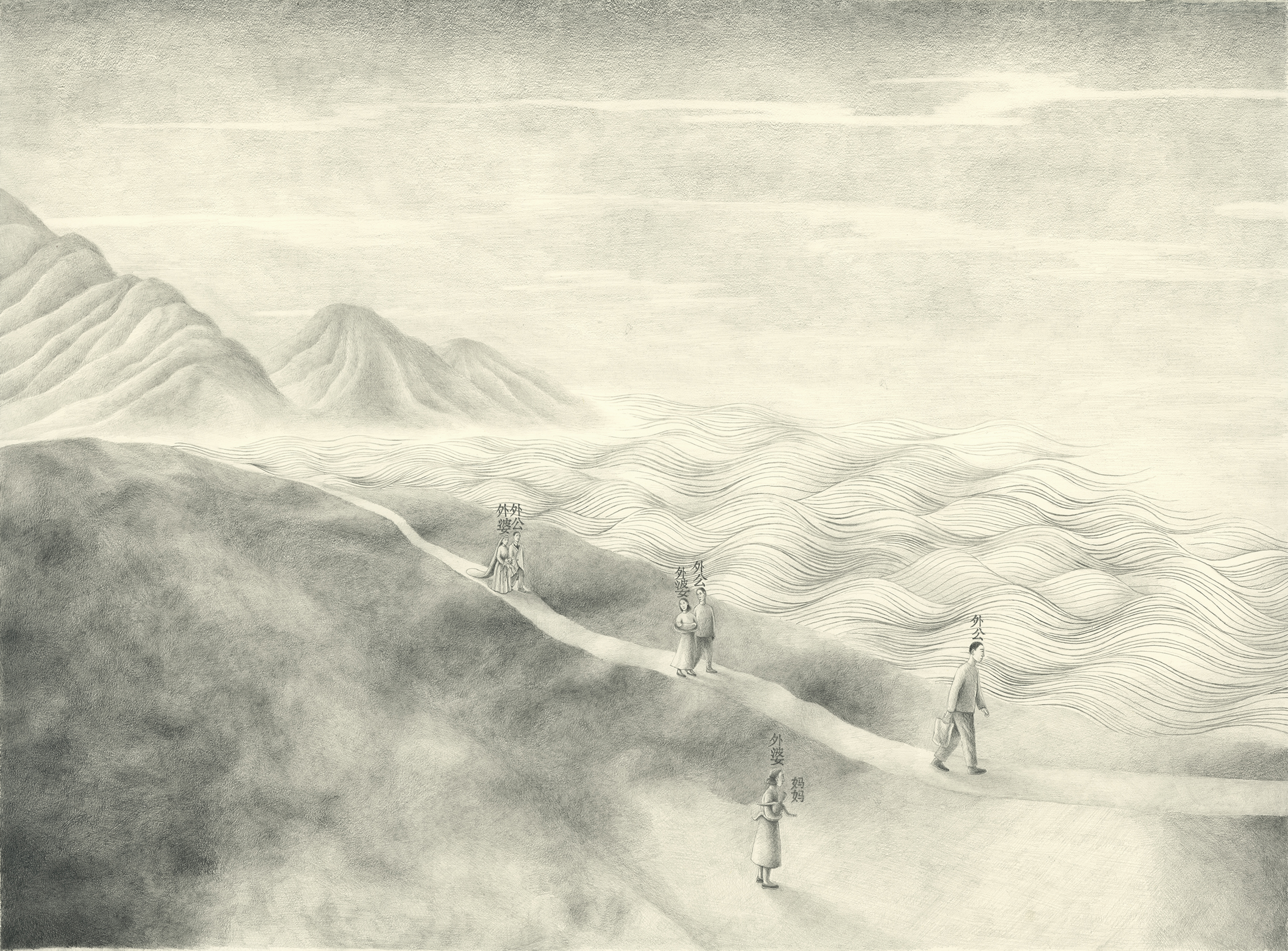 De zwart-wit potloodtekeningen van Tja Ling zijn ingetogen, mysterieus en surrealistisch. Voor haar project Before I was born sprokkelde ze haar familiegeschiedenis bij elkaar, en tekende ze de wonderlijke reizen die haar familie vanuit China heeft gemaakt om uiteindelijk in Nederland te belanden.
