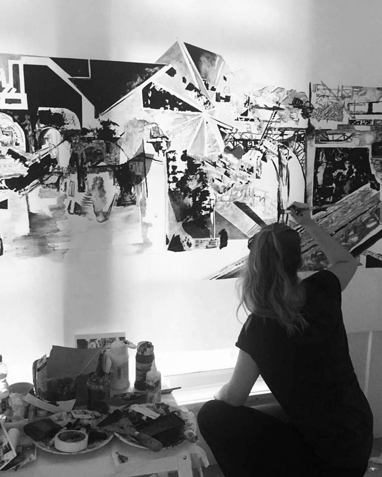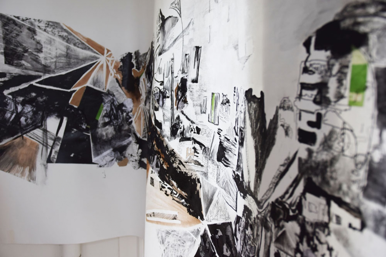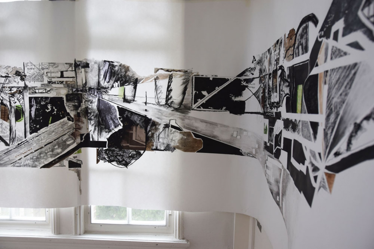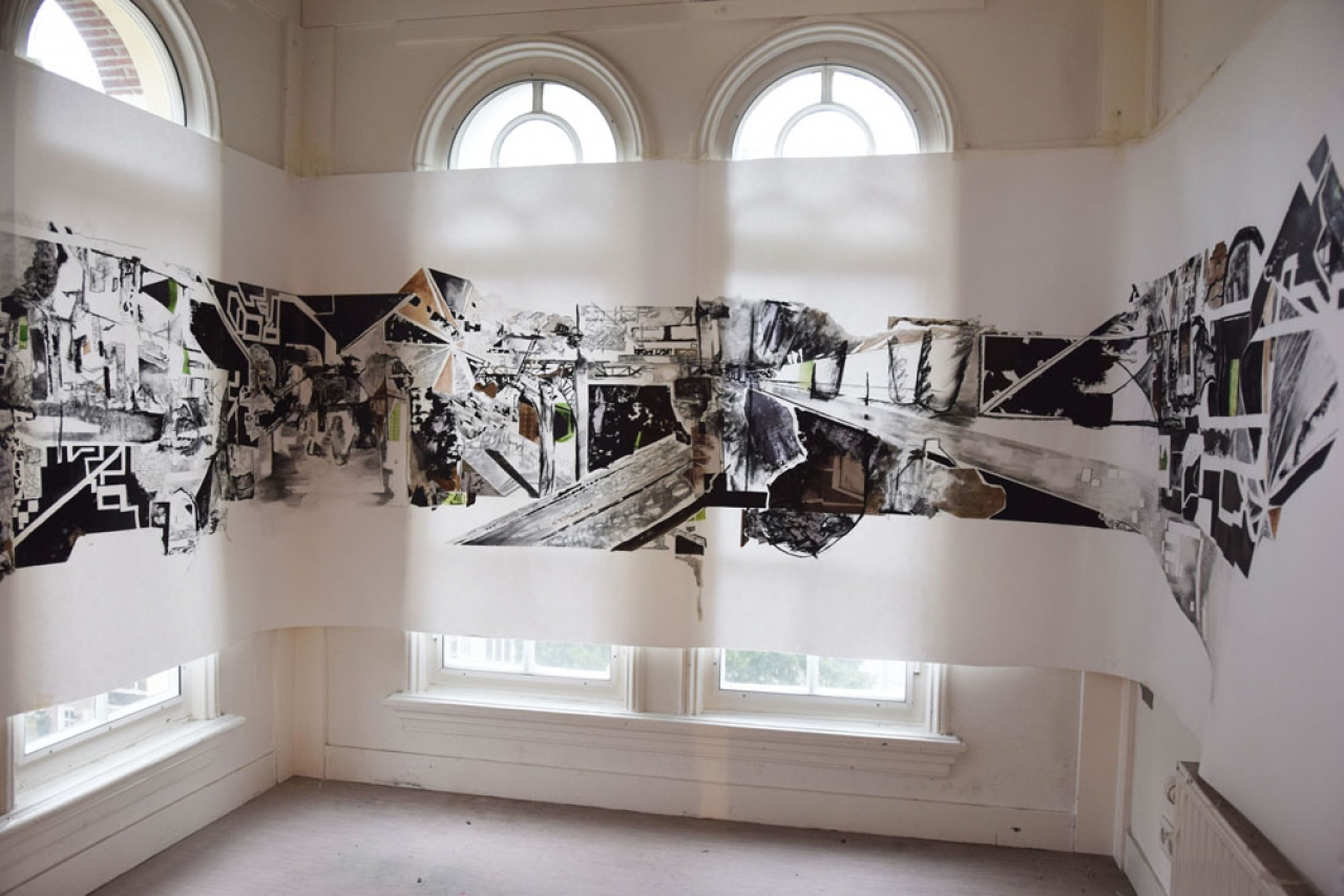 In eerste instantie was ik van plan om één wandvullende tekening te maken, maar toen ik in de Torenkamer stond kreeg ik een ander idee. Ik heb eerder nagedacht over een panorama tekening waar je als bezoeker instaat maar ontdekte nog niet een geschikte ruimte. De Torenkamer is dit voor 100%!