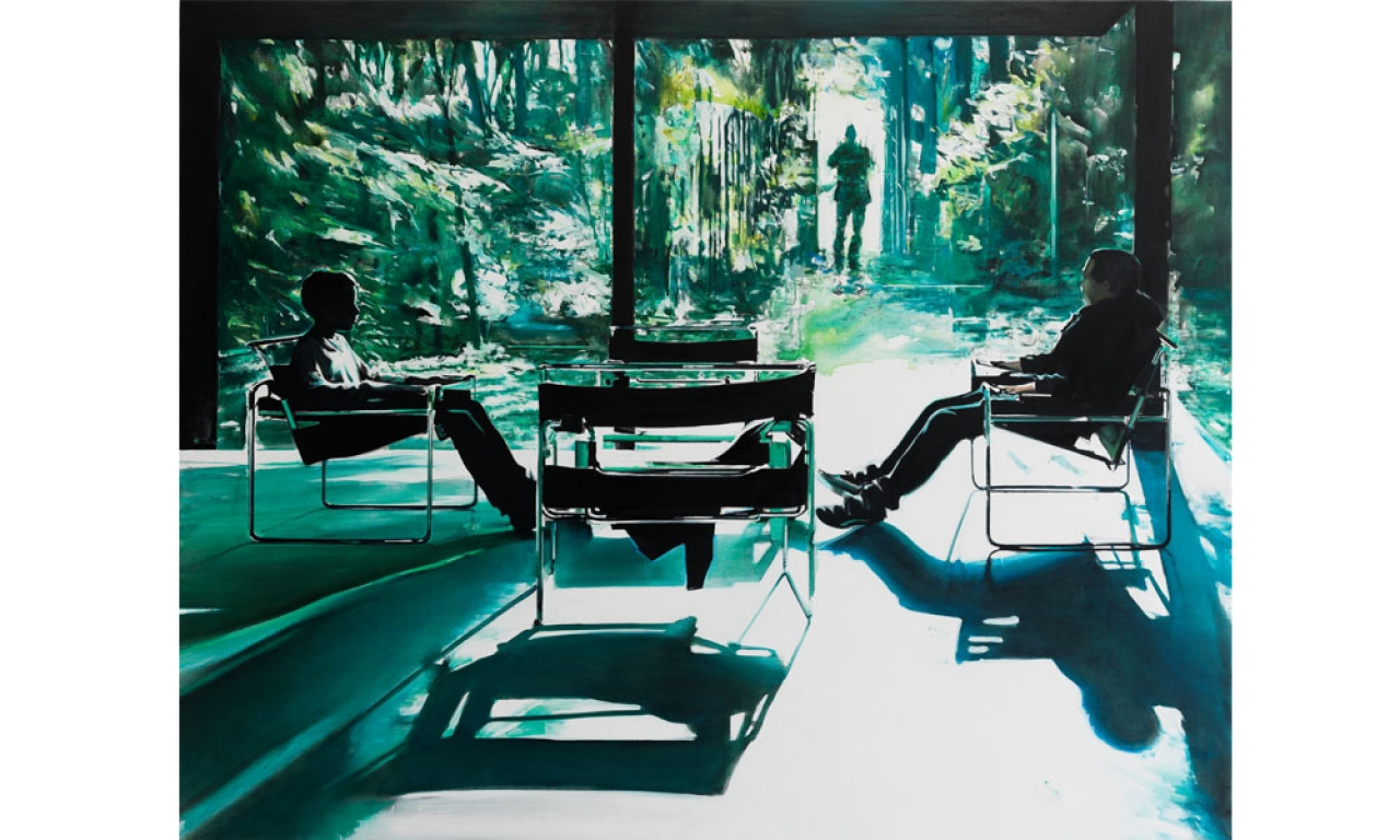 De serre kleurt groen en blauw. De tuin glijdt door de grote ramen naar binnen. Door het tegenlicht blijven van de lijven en de stoelen vooral silhouetten over. De rest lijkt weggegumd. In de reflectie van de ruit maakt iemand een foto. Om het beeld te vangen, waarschijnlijk, om er een herinnering van te maken. De camera onthoudt immers vele malen beter dan ons stugge geheugen.