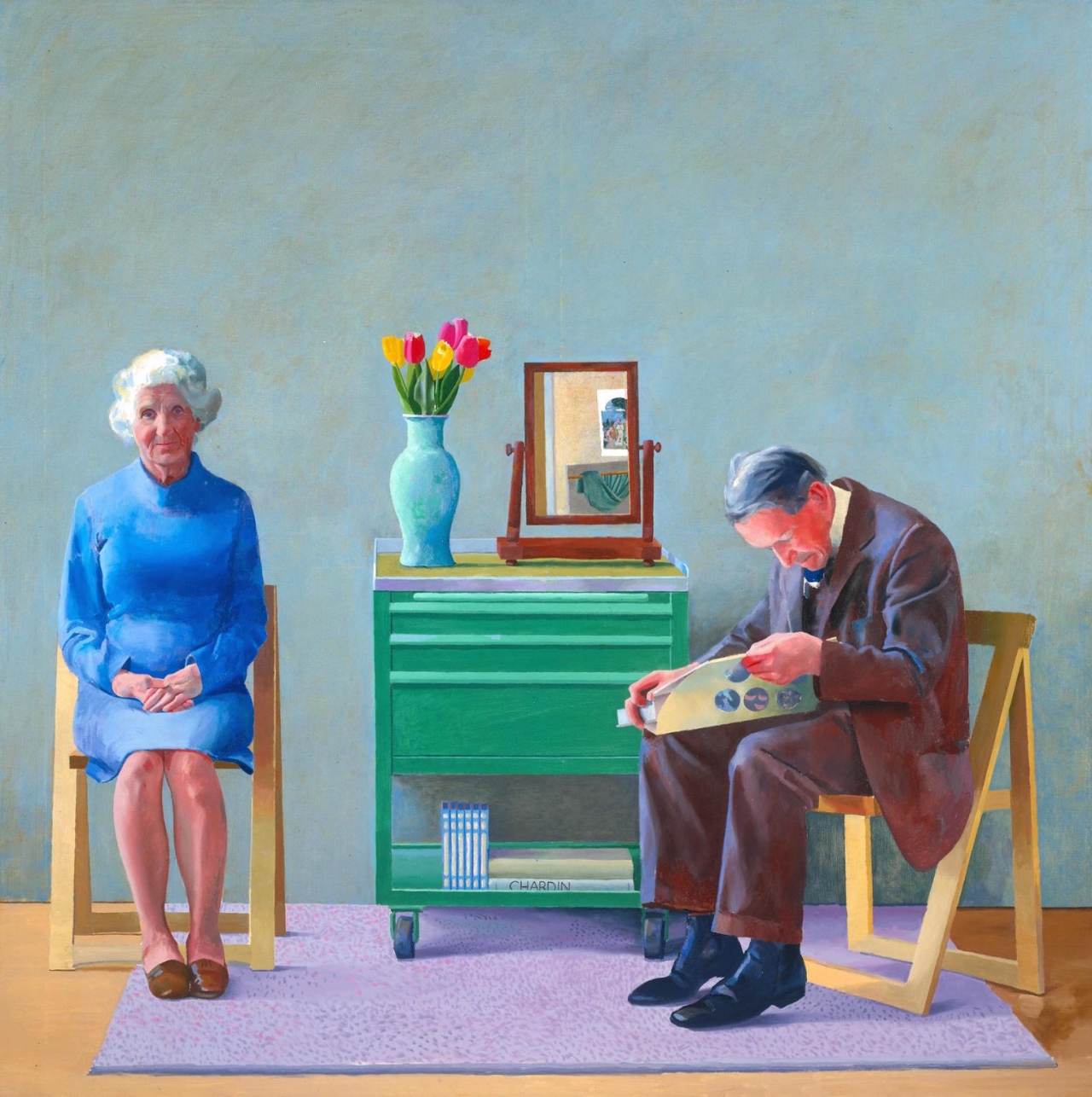 Zij kijkt me aan, zoals moeders je aankijken, hij zit voorovergebogen in een boek, zoals vaders uit ongemak maar een boek pakken om vervolgens heel geconcentreerd wat te bladeren. De ene liefde is de andere niet, maar het is dezelfde liefde. Er zit zo waanzinnig veel weerkaatsende genegenheid en intimiteit in dit schilderij dat het niet anders kan dan dit precies David Hockneys ouders zijn. Laura en Kenneth. Aangenaam.