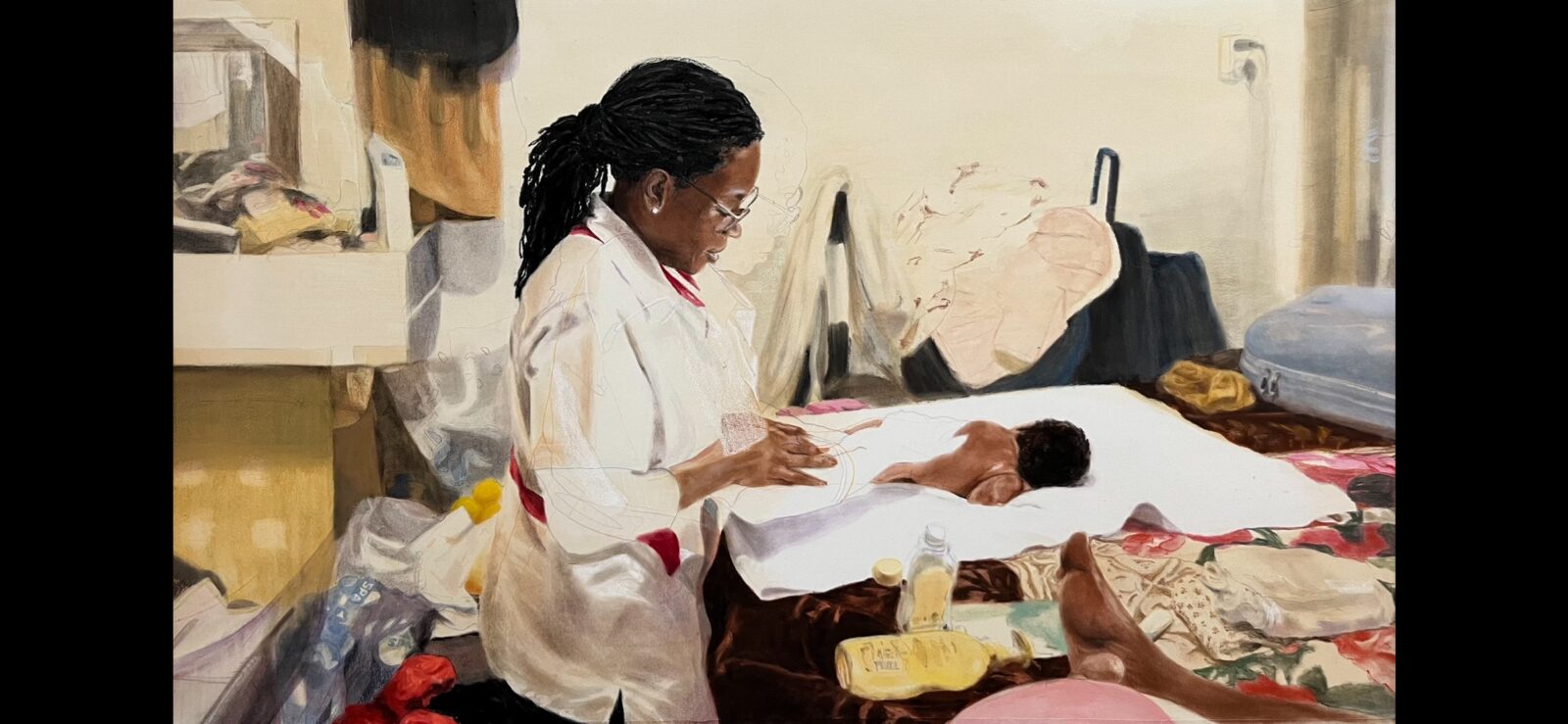 De eerste versie is een portret van Joyce, die aan het werk is in de H-buurt in de Bijlmermeer. Joyce zit op haar knieën aan de zijkant van het bed, in een volle, kleine kamer bij de moeder en haar dochtertje. Destijds dacht ik: deze tekening is af, dit is het. Maar na verloop van tijd begon ik te twijfelen. De tekening was net als het kamertje: heel vol en druk. Je ziet veel details, veel kleuren, veel voorwerpen, veel contrast.