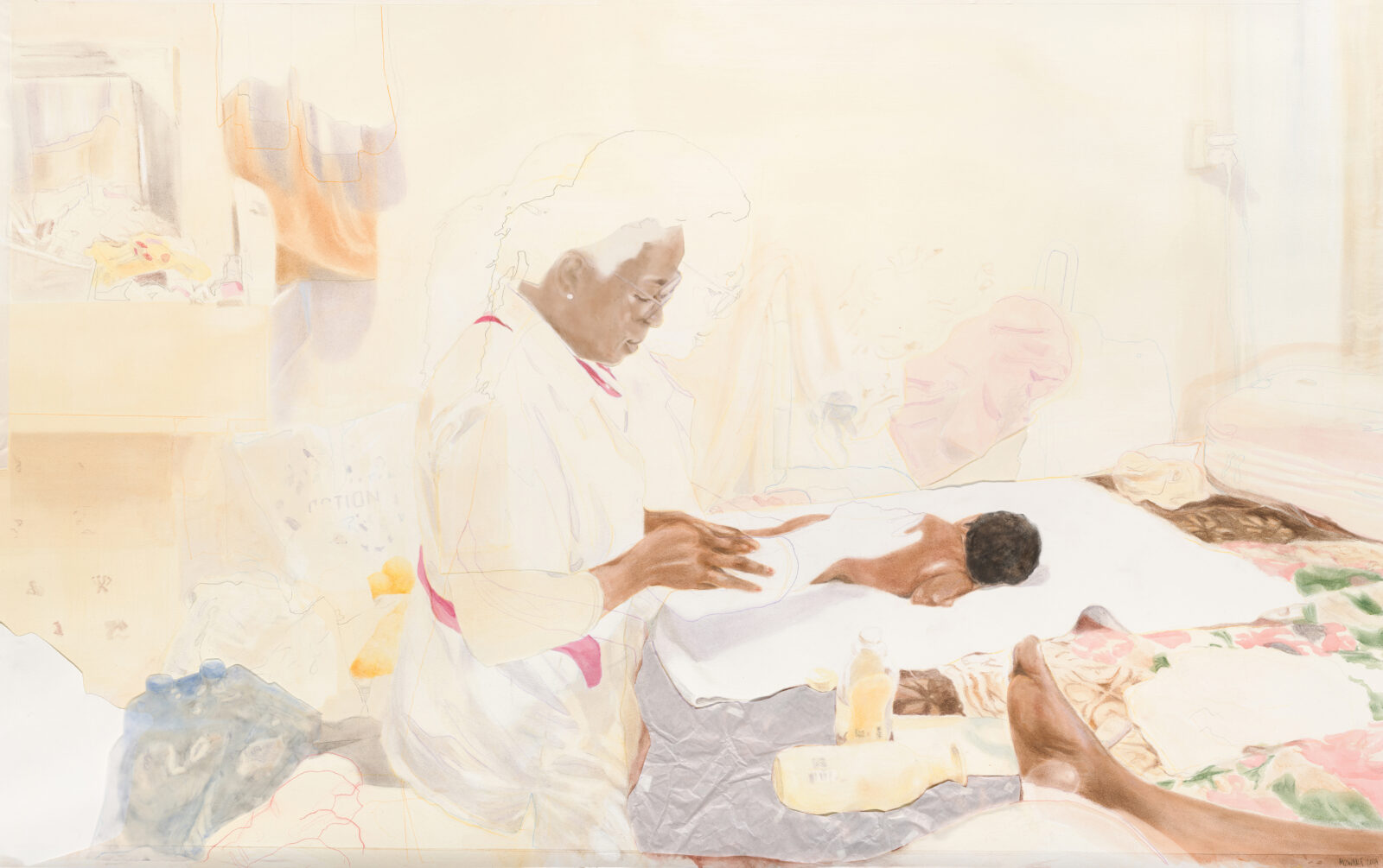 Ja, er zullen zeker mensen liever naar het harde en volle beeld kijken, maar toch vind ik de laatste tekening minder saai. Bonnard heeft een mooie uitspraak gedaan: “Ik wil alles laten zien wat je ziet als je de kamer binnenkomt: datgene wat mijn oog als eerste waarneemt.” Bij mij was dat bijvoorbeeld de hand van Joyce, die de baby met olie inwreef. Ik had ook alleen een kleine schets kunnen maken van de baby met Joyces hand, om juist dat te benadrukken. Maar ik wilde ook meer laten zien van de wereld waarin ik me bevond – een wereld waarin veel tegelijkertijd gebeurde.