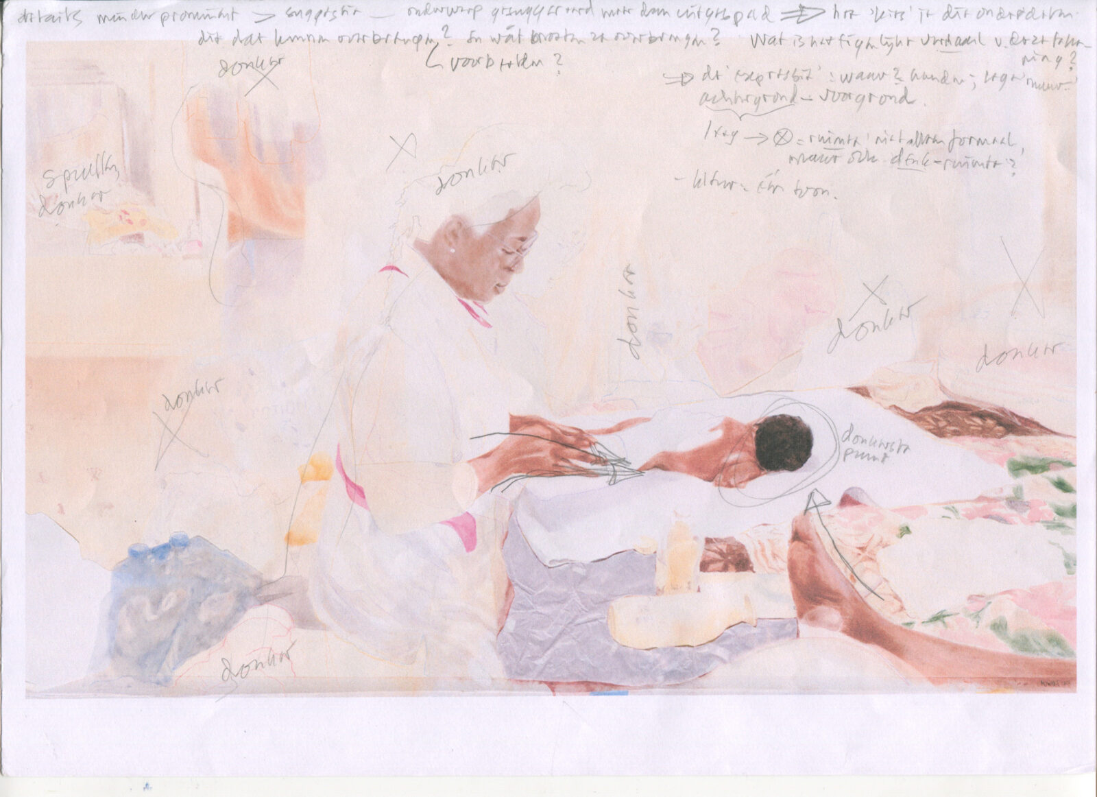 Dat klopt, en dat zijn twee verschillende werkwijzen. Er wordt vaak gezegd dat je niets kunt verbergen op een tekening. Jij was trouwens de eerste die me dat uitlegde! Elke handeling is zichtbaar, ook als je iets weggumt. Ik vind dat een prachtig beginsel en probeer het nu veel toe te passen. Het liefst doe ik dat al tekenend, terwijl ik naar mensen kijk en met ze praat. Maar ook in mijn atelier, tijdens het bewerken, reproduceren, en selecteren van de camerabeelden die ik in de bevalkamer heb gemaakt, probeer ik te laten zien hoe het tekenproces is verlopen. In de werkelijkheid van mijn atelier kan ik de ‘echte’ uitwisselingen van buiten ook nog een keer van een afstand bekijken, contextualiseren, herhalen of uitlichten. Die afstand is soms heel verhelderend.