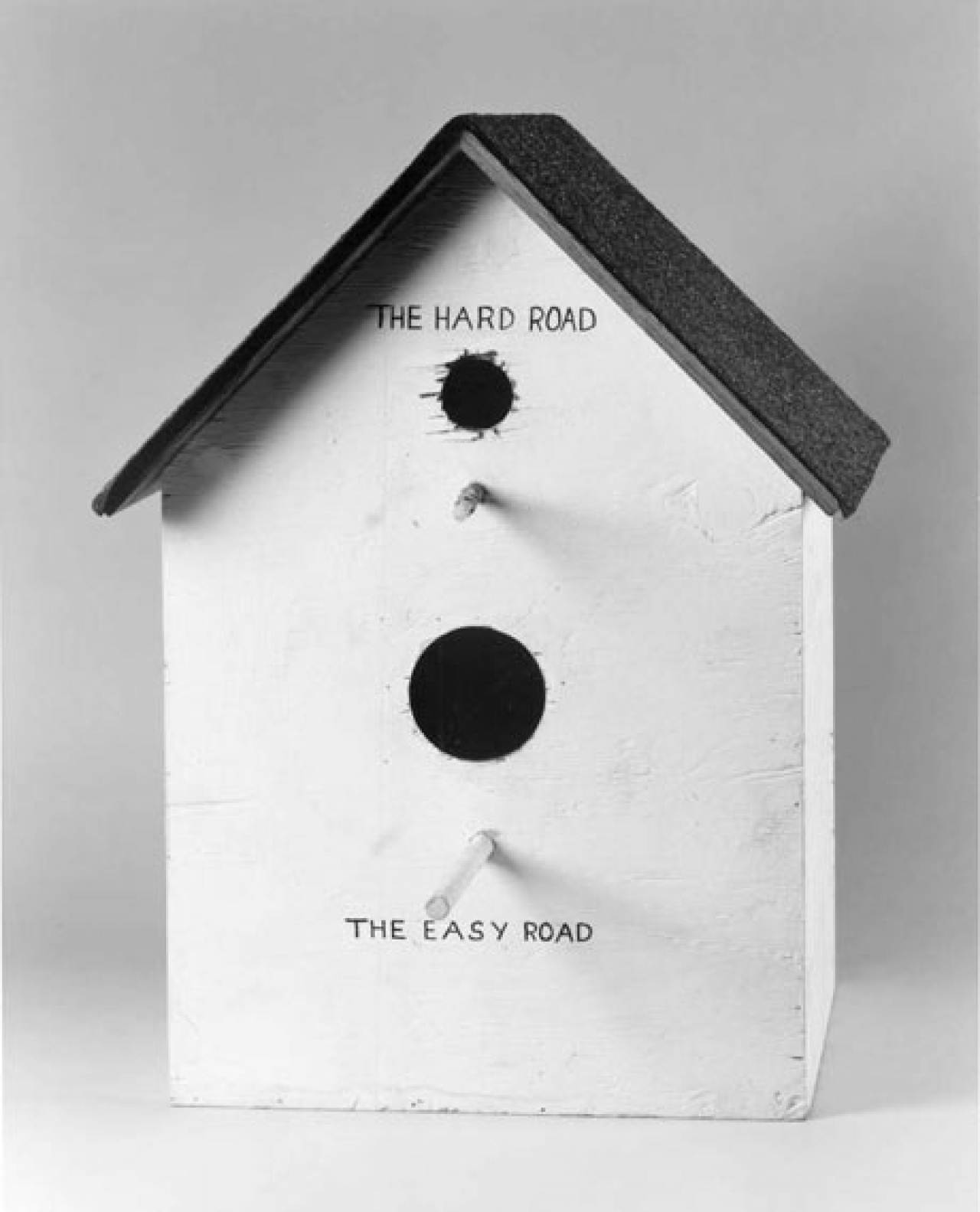 Twijfel is het niet kunnen kiezen tussen de mogelijkheden die zich voordoen, en bij het woord twijfel moet ik onmiddellijk denken aan het werk Catholic Birdhouse van Mike Kelley, waarin The hard road en The easy road worden verbeeld. Het bijbels thema van de smalle en de brede weg spiegelt de mens een keuze voor tussen het smalle pad, dat vol opoffering is en bezaaid met hindernissen maar wel leidt tot het eeuwige leven, en de brede weg. Deze brede weg is een makkelijk begaanbaar pad, aantrekkelijk, vol genietingen en leidt tot de hel. Een nogal ongemakkelijke keuze, het Katholieke geloof prentte je in dat je aardse leven in dienst staat van het eeuwige leven en door de keuze tussen de ene en de andere weg zo te polariseren kan er niet anders dan een voortdurende twijfel heersen of je het wel goed doet. Kijkend naar het vogelhuis van Mike Kelley weet je onmiddellijk dat de keuze misschien wel anders ligt dan dat je wordt verteld. De harde tegenstellingen in het maken van keuzes tussen goed en slecht, tussen moeilijk en makkelijk, tussen hel en hemel brengt het maken van een keuze tot een bijna levensbedreigende positie. Maar de werkelijkheid is anders. Gelukkig.