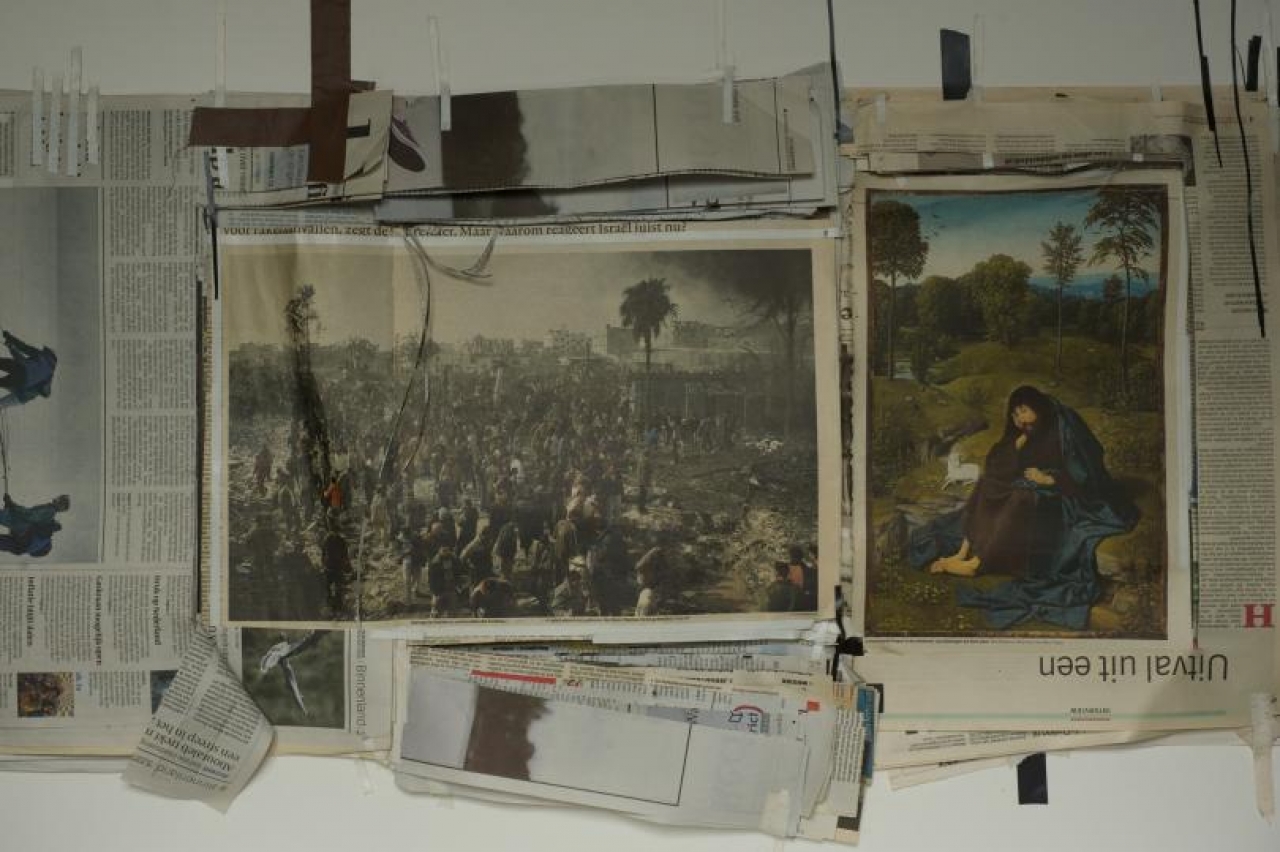 En zo komen allerlei tijdsmomenten tezamen: eenzelfde plek maar er zitten eeuwen tussen, twee afbeeldingen uit kranten die op verschillende dagen verschenen omringd door nog weer andere dagkranten, een schilderij uit de vijftiende eeuw waarin de kunstenaar Geertgen tot Sint Jans terug kijkt in de tijd. Bovendien is Johannes de Doper een Bijbelse figuur die ook in de Islam voor komt en die als de profeet die twee werelden doet versmelten. De kunstenaar verbindt de actuele situatie met andere tijden en lijkt daar vooral mee aan te geven dat de menselijke conditie niet of nauwelijks verandert.