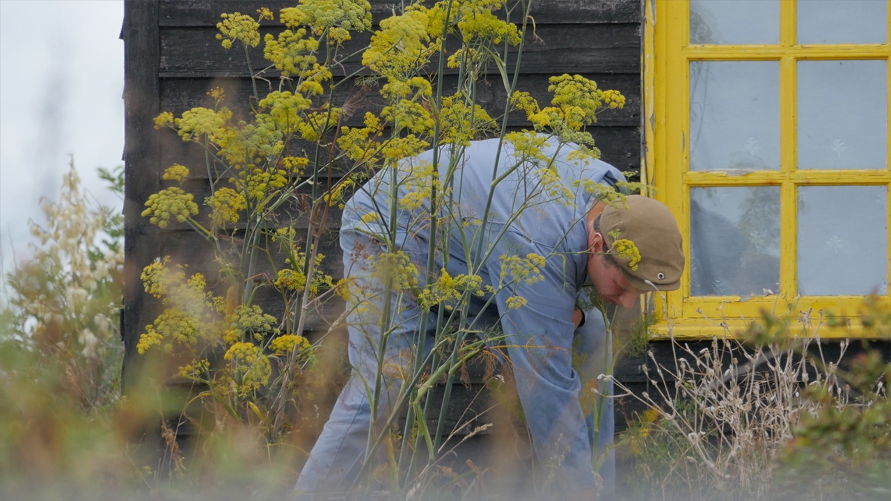Op de film still uit de video Headland van Jort van der Laan laat hij zien hoe de tuin van Derek Jarman van een desolaat landschap verandert in een poëtisch stilistisch vormgegeven tuin, waarin gevonden stukken ijzer in sculpturen zijn veranderd en een geheel worden met de bossen struiken. De kleuren zijn te herleiden naar de herfst, het seizoen van verval en converseren met de grijsblauwe lucht en ook weer met het grind op de grond. De hemel, de aarde en de natuur worden met elkaar verbonden.