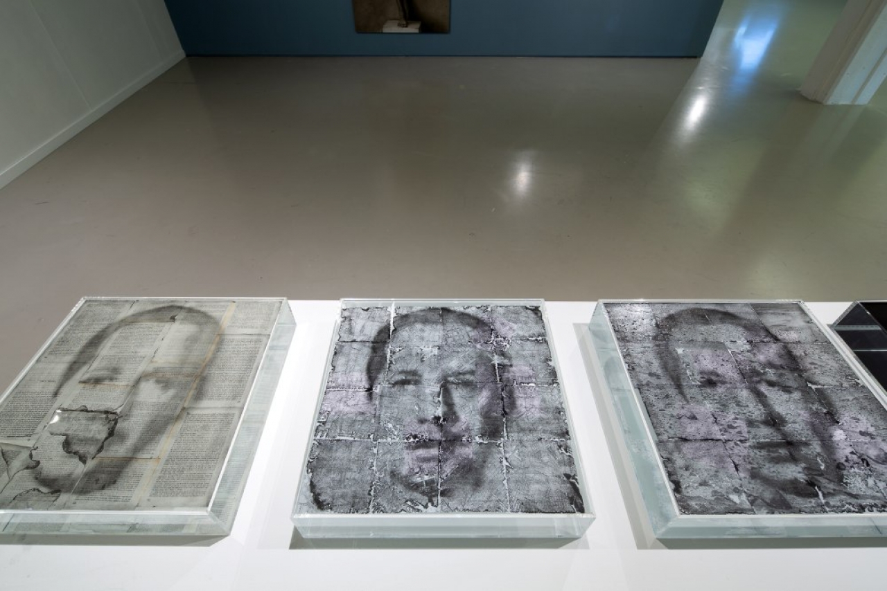In Muñoz’ tweede werk gaat dit proces veel langzamer. Vijf weken hebben de zelfportretten nodig om onherkenbaar te worden. Op het moment dat ik er ben is de derde week net ingegaan. In een bak met water liggen ze, houtskoolpoeder op bladzijdes uit de Spaanse editie van George Orwell’s 1984 en plattegronden van een vermoedelijk Colombiaanse stad. Door zijn portret in houtskoolpoeder op deze bladzijdes te zetten lijkt Muñoz het geweld in zijn moederland te willen personaliseren. De portretten verdwijnen en verschijnen, zoals er steeds nieuwe generaties Colombianen geboren zullen worden, terwijl er aan de geschiedenis, het geschreven woord dat zich op het papier bevindt, niets verandert. ‘Wanneer kan ik mijn portretten met inkt op een vredesverdrag afdrukken?’ Dat lijkt Muñoz te zeggen.