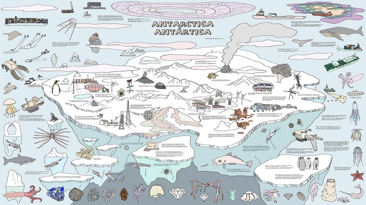 Lang staan Van Beek en ik te kijken in de zaal met de serie Overspill: Universal Map van Rikke Luther. Het zijn prachtig geïllustreerde wandkleden met ‘global commons’, de diepzee, de atmosfeer en het heelal. Plaatsen die zich buiten de bestaande landsgrenzen bevinden, maar waar ook op allerlei manieren grondstoffen (kunnen) worden gedolven. Wandvullende infographics zijn het eigenlijk, die in kaart brengen op welke manieren de mens de leefomgeving uitput. Te land, ter zee en in de lucht. ‘Eigenlijk zijn dit ook modellen’, zegt Van Beek, ‘Alles is met lijntjes aan elkaar verbonden.’