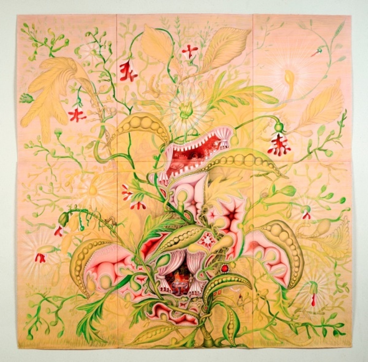 Ik wil graag een tekening van Kinke Kooi presenteren. Meestal wordt in een museum een introductie op het werk gegeven in woorden. Dat legt naar mijn idee alles zo vast: zo moet je er naar kijken, dit betekent het. Woorden werken snel absoluut. Ik wil graag een open introductie op het werk geven, een kijkje in de denkwereld van de kunstenaar en een plek waar je in alle rust naar de tekening kunt kijken. De tekenig die aan de ene wand van de ruimte komt te hangen is The Flower and her Inner Focus uit 2014. Daar tegenover komt een beeldenreeks.