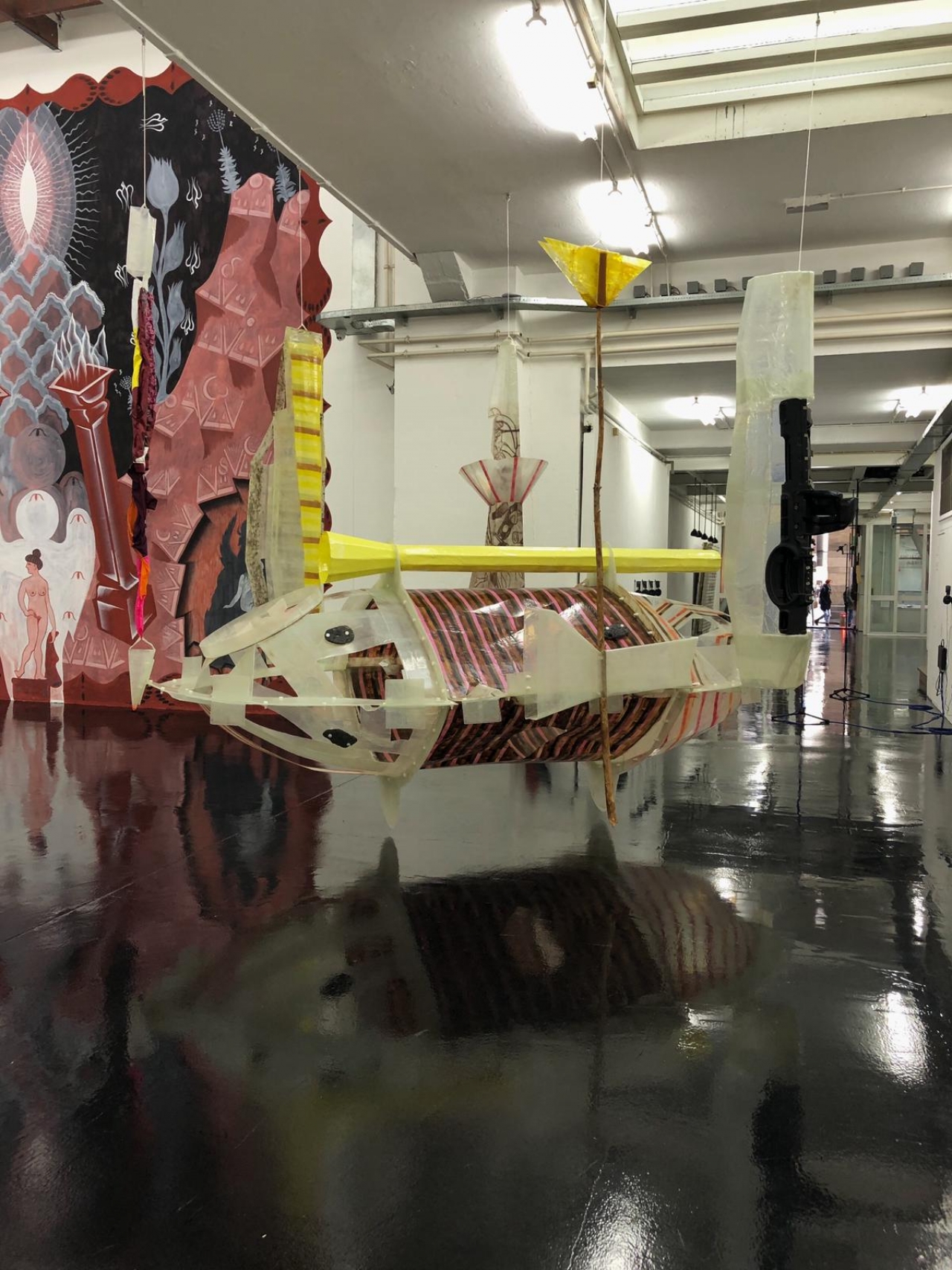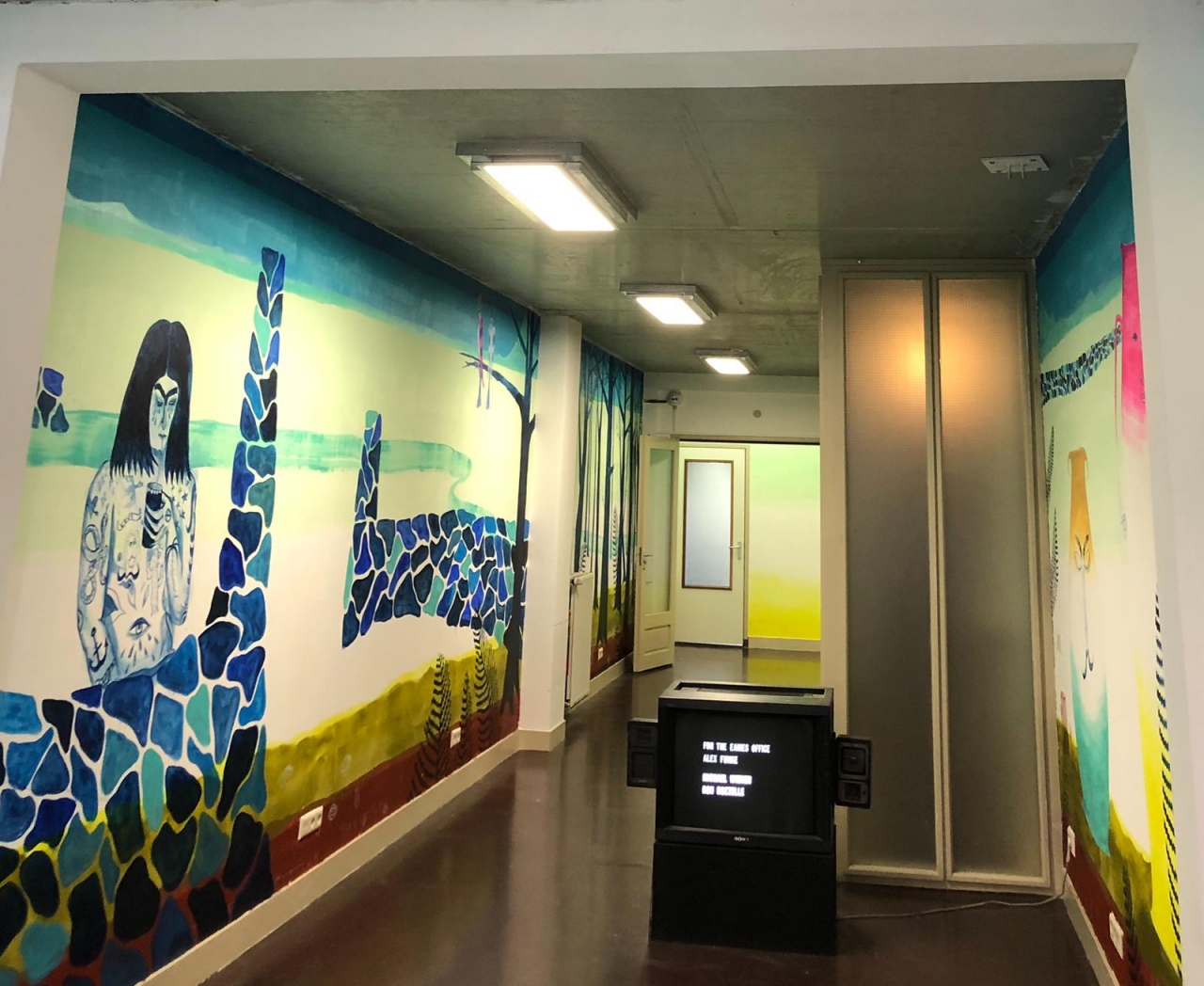 De muren zijn grotendeels wit, maar bij de ingang piekt er al een klein voorproefje van de muurschilderingen van Marie Aly, Capri Ciosa, die boven te zien zijn. Zo volg ik de kleuren de trap op en beland in de ‘Polar Room’ waarvan alle muren zijn beschilderd en de toeschouwer zich in een vreemde droom waant. Omringd door bomen, menselijke wezens, vogels, lijnen en figuren stap je even in een andere wereld. De muurschilderingen zijn intuïtief geschilderd zonder voorbedachte schets en kunnen zo uit veel lagen bestaan. Ze ontstaan vanuit haar eigen ervaringen, de kunstgeschiedenis en uit verschillende culturen. En tonen goed de mogelijkheden en de vrijheid die de kunstenaar krijgt in W139.