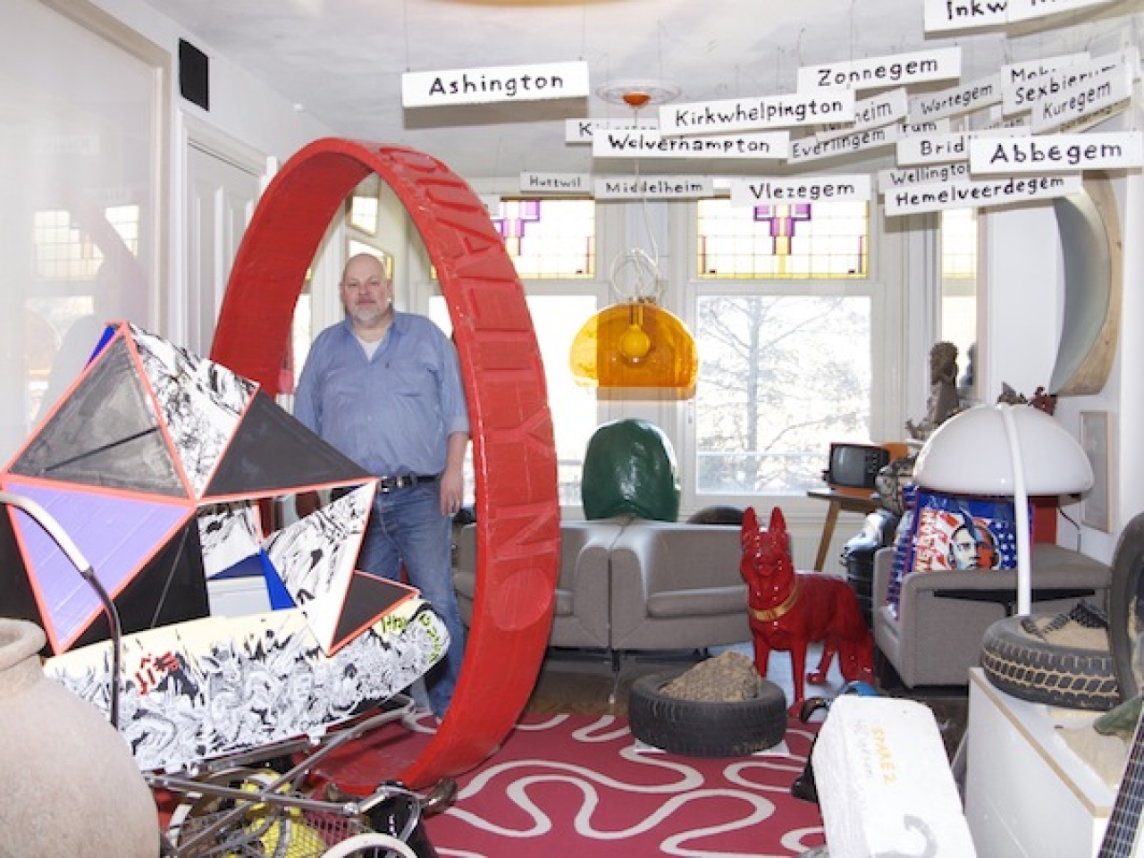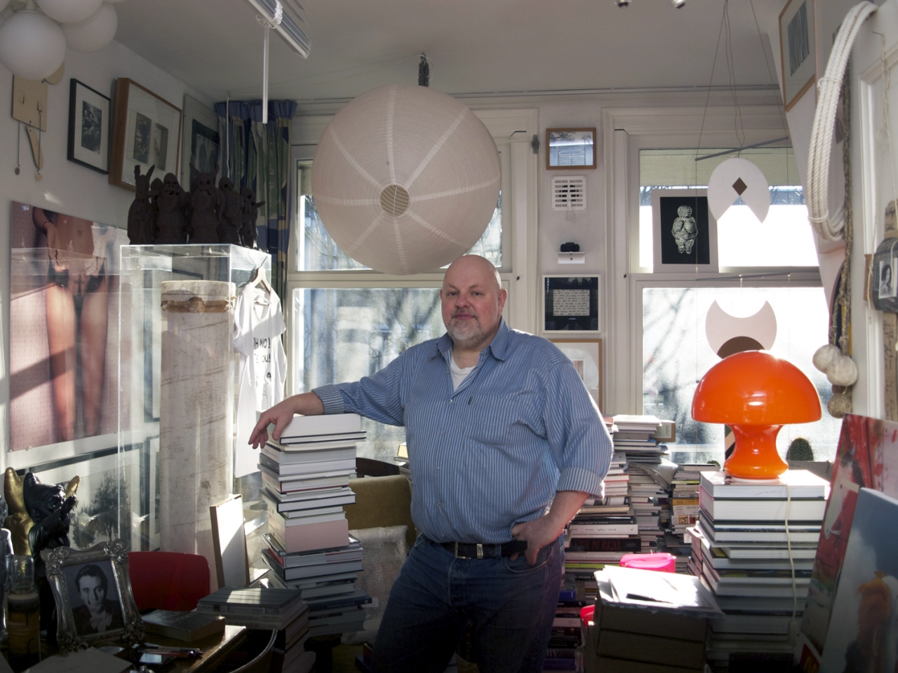 ‘Sometimes a person never comes back’, lees ik op een velletje papier. Hoe hoger ik kom hoe erger het wordt, in de woonkamer kun je nog net op een stoel aan een tafel zitten te midden van alle stapels boeken en kunstwerken die tegen elkaar aan leunen tegen de muur. Het is tjokvol. Deze man dompelt zich onder in de kunst.