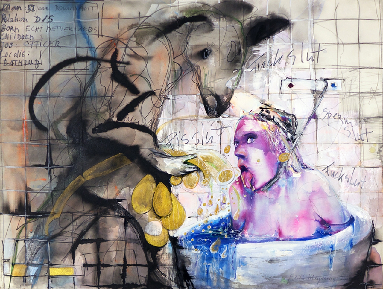 ‘Loutering’ is een woord dat meteen opkomt, als je je verdiept in het leven en werk van Edith Meijering. Ze heeft het nodige doorstaan en heeft zich verschillende malen na ingrijpende gebeurtenissen moeten herpakken. Dat is niet zonder slag of stoot gegaan en het heeft in haar kunstenaarschap tot noodzakelijke zelfoverwinningen geleid. Haar idioom als kunstenaar valt voor een deel samen met haar persoonlijkheid: kleurrijk, uitbundig, overweldigend, genuanceerd, virtuoos en groots. Ze schildert met beheerste, brede gebaren die ze als een dansante choreografie op papier en andere ondergronden de vrije loop laat. Ze vervloeit als mens met wat ze maakt. Al de twijfel en onzekerheid in haar hoofd komt ze te boven als ze haar verbeelding de vrije hand geeft; dan bestaan er voor haar geen taboes en beperkingen die haar in het dagelijkse leven wel parten kunnen spelen. Gedragingen in de menselijke omgang – botheid, vernederingen, onverschilligheid, agressiviteit, onderdanigheid – die ze persoonlijk ethisch of moreel verwerpelijk vindt, behandelt ze in haar werk zonder scrupules.