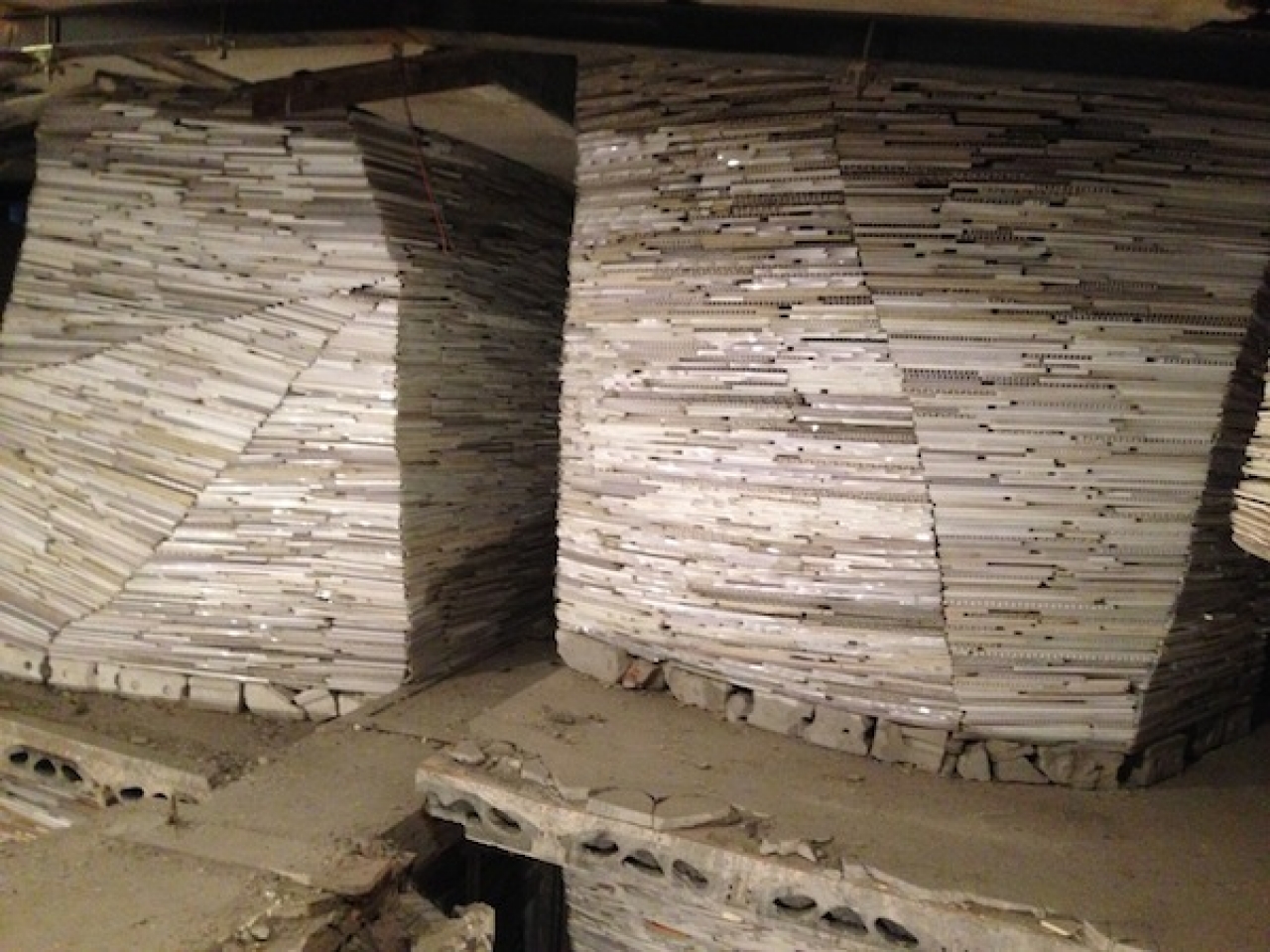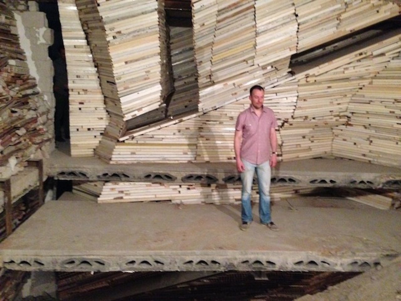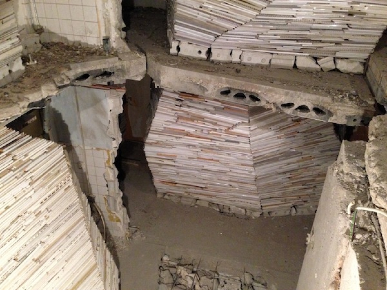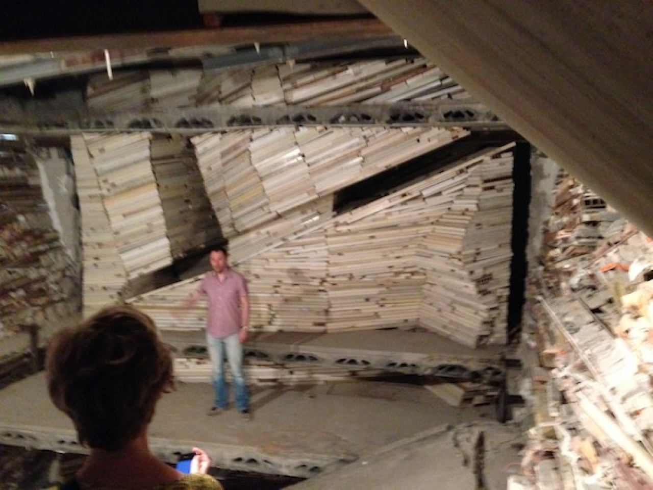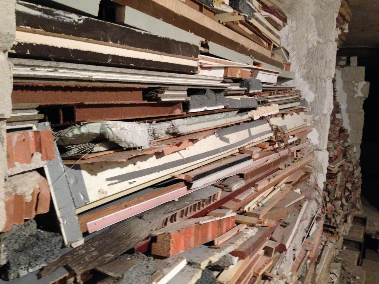 erwoest Huis Op Noord is een overweldigende ervaring van verwoestende schoonheid. Vloeren zijn scheef gezet of verzakken; wanden zijn er deels of volledig uitgeslagen. Vloeren vallen loodrecht naar beneden (en worden zo weer wand) of vallen in een kruis. De stapelingen, die alle wanden bedekken (chaotisch of juist zorgvuldig geordend tot architectonische sculpturen) hebben uitgesproken vormen. Alles staat én is scheef. Een monumentale constructie, het inherente falen nadrukkelijk in zich herbergend.
