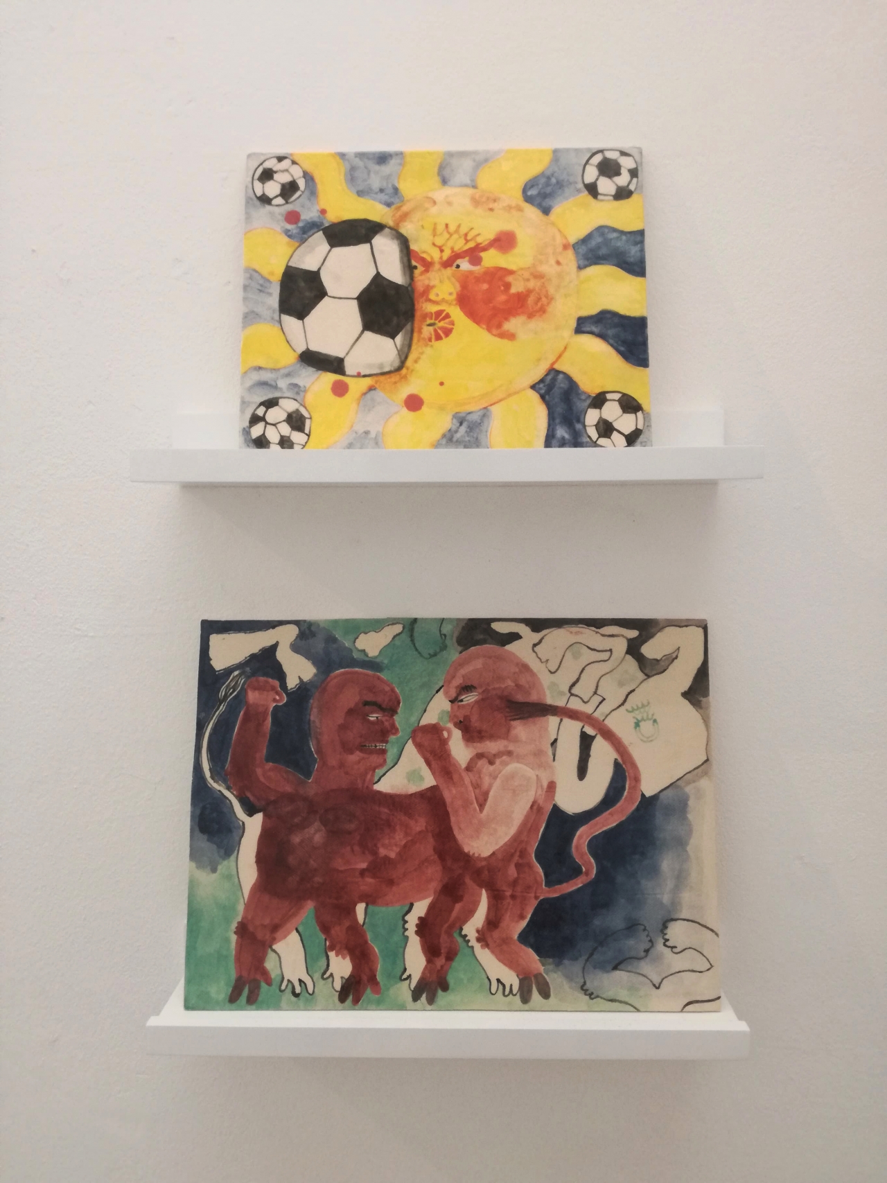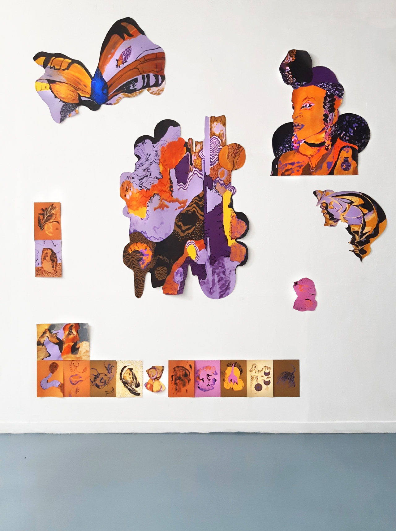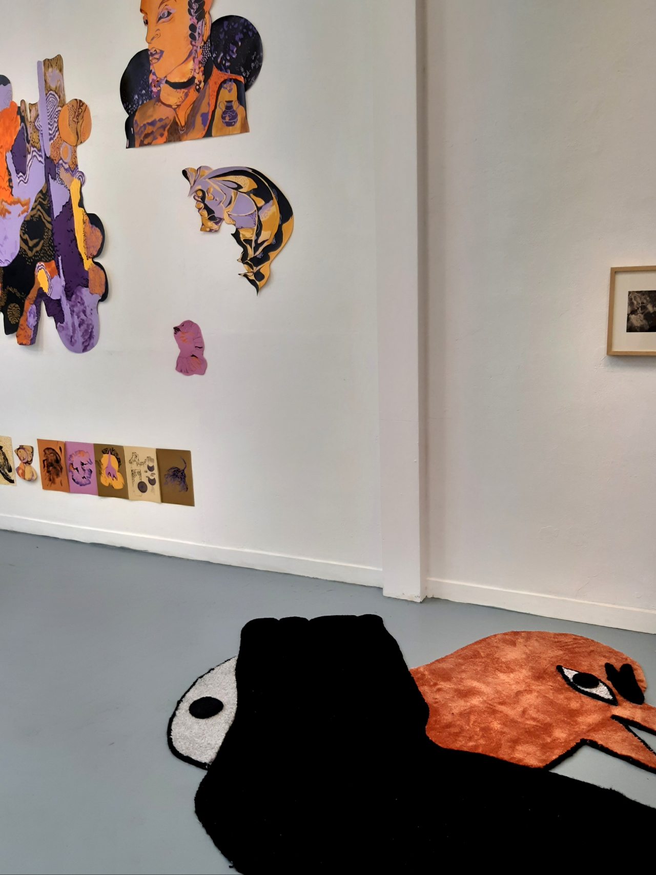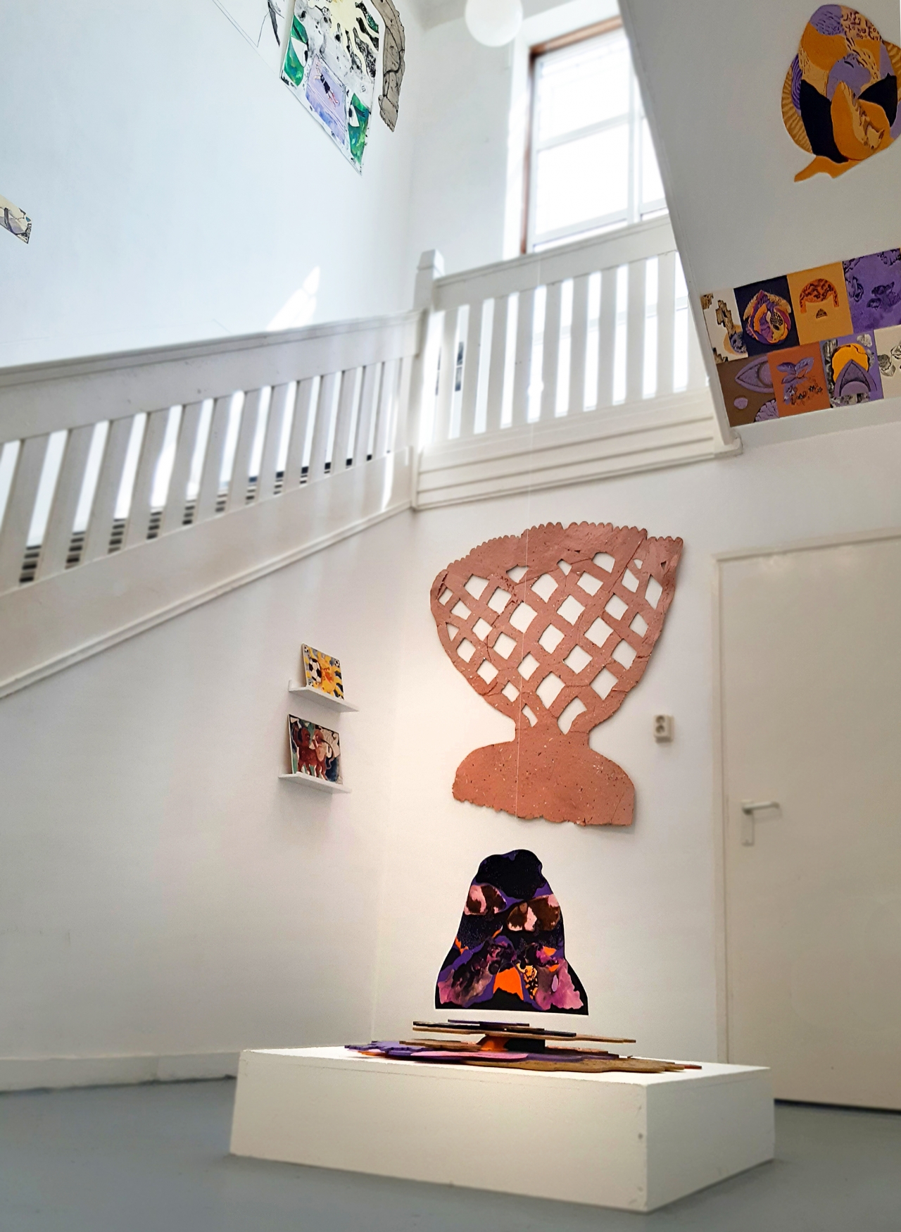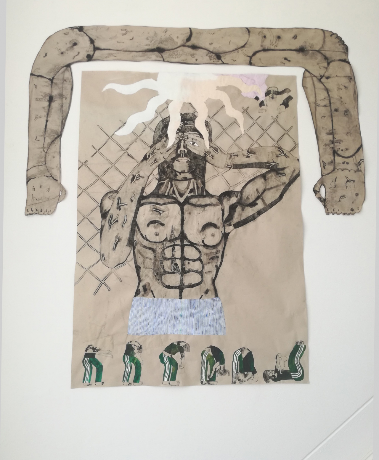 De film is bovendien echt een samenwerking, terwijl ze tijdens de tentoonstelling ieder eigen werk exposeren. Dat geeft de kunstenaars niet alleen de ruimte om meer van zichzelf te laten zien, maar ook om bepaalde thema’s verder uit te werken. Voor Groot Koerkamp zijn dat woede en schaamte. Dat is terug te zien in tekeningen die over die emoties gaan, en die ze als het ware heeft omlijst met opmerkelijke papieren armen die alles naar zich toe te lijken trekken, bang om ze met anderen te delen. Nypels werkte een belangrijk thema in haar kunst verder uit: beschutting zoeken. In de film vindt de jongen uiteindelijk geborgenheid bij zijn ouders, en tijdens de expositie biedt de natuur die. Op een van de tekeningen is een oermoederfiguur te zien, die zowel iets menselijks als dierlijks heeft. De voor Nypels kenmerkende natuurlijke texturen zijn ook in deze figuur terug te zien. Zo claimen beide kunstenaars hun eigen plaats.