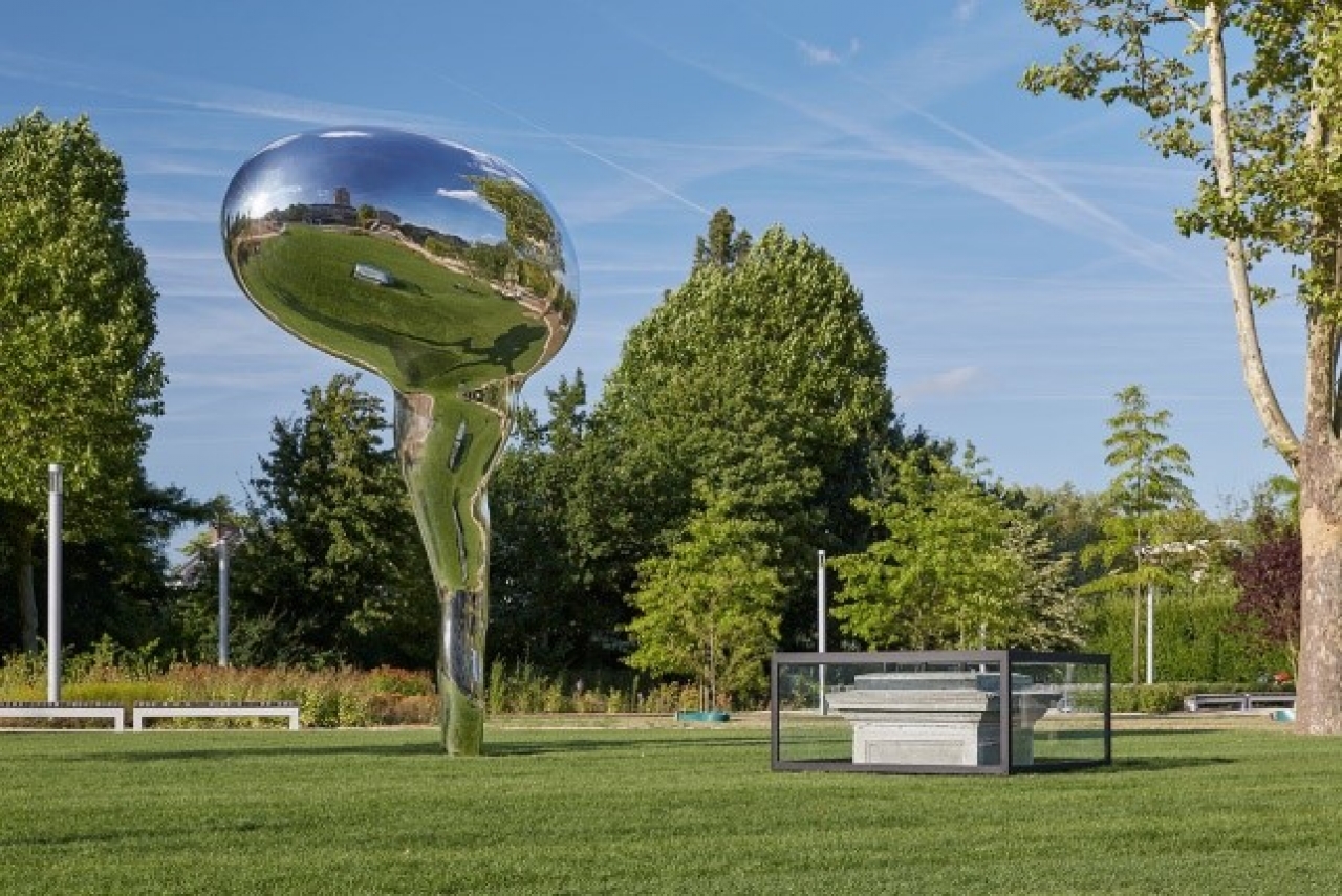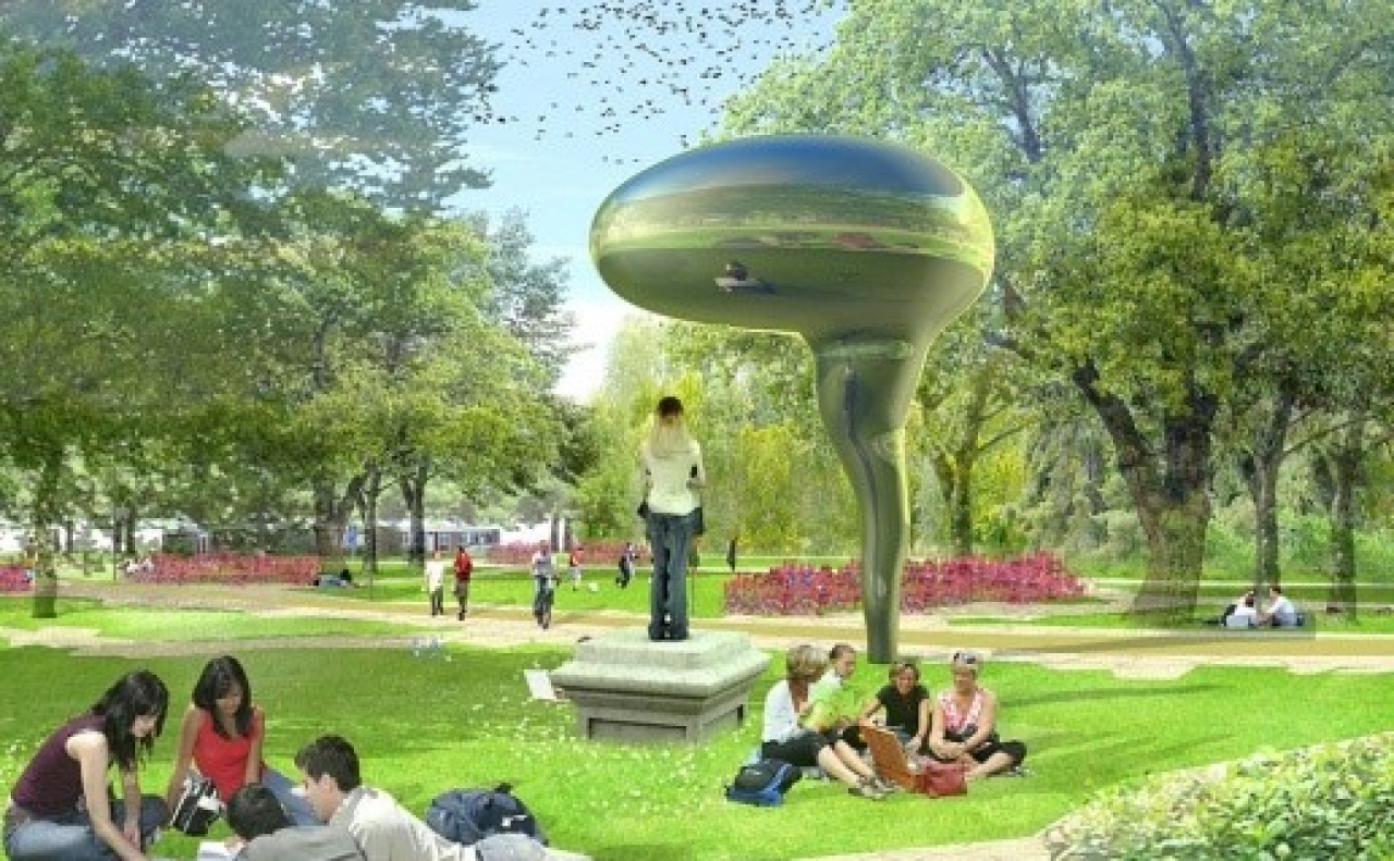 Het bestaat uit twee delen. Een enorme spreekballon of gedachtewolk van roestvrijstaal glinstert je tegemoet. Universiteit en campus worden erin weerspiegeld. Die hele denkwereld, vol van studie, kennis, verbeelding en vooruitgangsoptimisme, licht op in de gedachtewolk. Maar dat is nog niet alles.