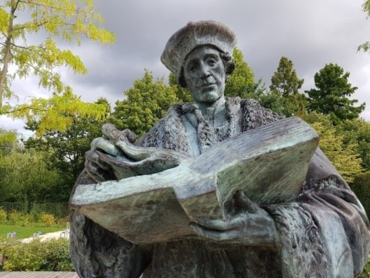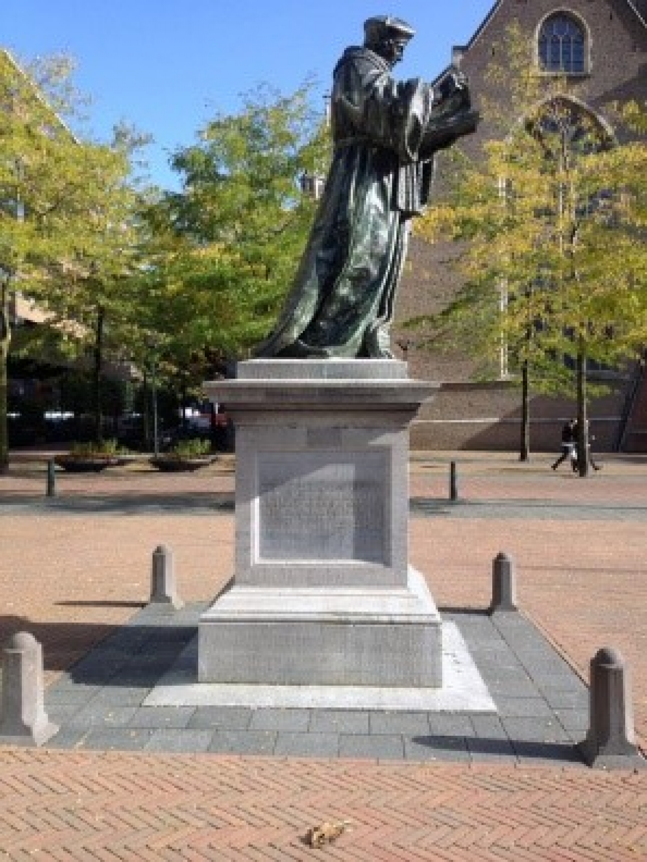 Erasmus zelf, geen zorgen over hem, staat intussen nog altijd pal overeind bij de Laurenskerk, op een recent voetstuk. Beeldende kunst pakt doorgaans niets af, maar voegt iets toe aan ons bestaan. De oude, in de oorlog beschadigde sokkel was in de jaren zestig al vervangen en gedumpt bij het Erasmiaans Gymnasium; handig als hangplek tussen fietsen en brommers.