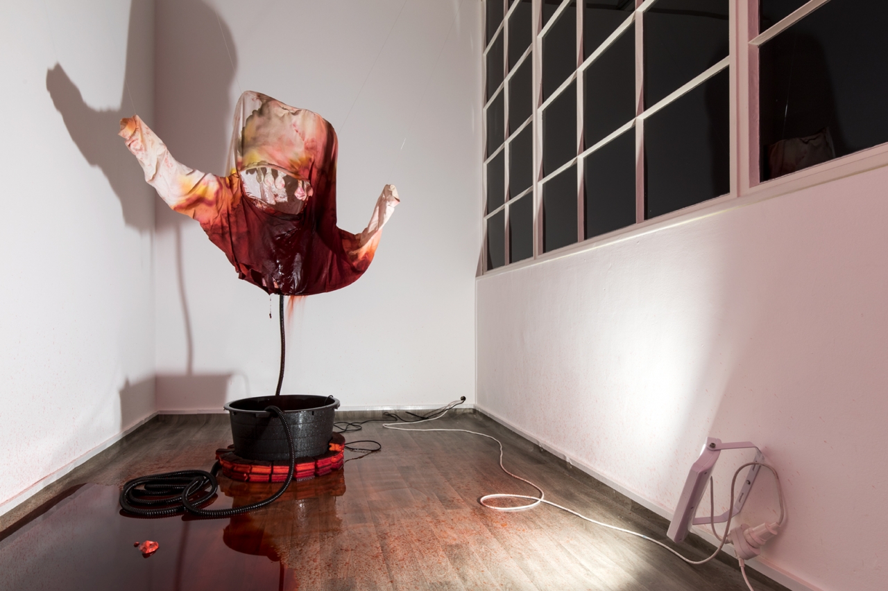 De teil is niet groot genoeg om alle vloeistof te verzamelen en er ontstaat een langzaam groter wordende plas op de vloer. Aan de overkant staat een soortgelijke installatie: eenzelfde trui – ditmaal rechtop gehangen, weer een fontein en een teil met een plens bloed.