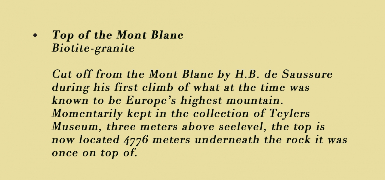 It’s not easy to keep a secret place. We like to be somewhere first. The idea of being the only one seems liberating. There is an incomparable joy to reaching a personal resort without crossing even a single elephant path. As if a stream is less refreshing if other hands have cupped and drank from it; as if a panorama pretentiously composes itself having been witnessed by the multitudes. I can therefore imagine that many mountaineers got frustrated discovering that any day-tripper can visit the top of the Mont Blanc in Haarlem. For it was in the Teylers Museum that I saw, displayed in a glass cabinet, the top of what for centuries was known to be Europe’s highest mountain.