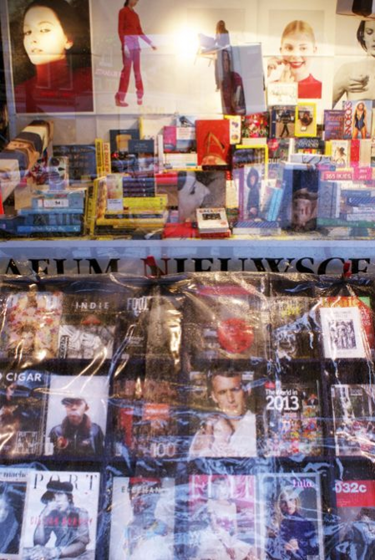 Het sneeuwt buiten de eerste vlokken van de winter en de tijdschriftenwinkel heeft geen voordeur. Juist omdat de winkel altijd open is, loopt het makkelijk naar binnen. Binnen tref ik Petra Noordkamp met een collega. Petra werkt al lange tijd in de winkel en kent alle plekken, stapels, rekken en schappen van haver tot gort. Ze draagt een dikke trui en dat is nodig want de wind waait venijnig. De kranten en tijdschriften buiten de winkel zitten onder een stevig plastic zeil, de rest van de bladen ligt opgestapeld binnen in de winkel. Ondanks dat al die magazines heel veel tijdschriften op ‘een hoop’ lijken, heeft ieder blad een eigen, vaste plek. Deze plek wordt bepaald door praktische zaken, zoals de mate waarin een magazine verkocht wordt, of de mate waarin Petra en haar collega’s het tijdschrift bijzonder vinden. Op de vraag hoeveel magazines er op dit moment in Athenaeum zijn begint Petra te lachen. ‘Pfff…duizenden denk ik’ antwoordt ze. Ze telt snel één rek en vermenigvuldigd dit rek keer het aantal andere rekken. Een ruwe schatting brengt haar op meer dan 3.000 verschillende kunst-, reis- en kookmagazines uit alle windstreken. Het is een zeer bijzondere collectie. Zo zie ik bekende bladen, als de Vogue, de Uppercase, the Gentlewoman, Flow, natuurlijk mister Motley en bekende kranten, of kookmagazines. Misschien ken ik tweehonderd titels, magazines en makers. Dat betekent dat ik 2800 titels niet ken. Overbodig lijkt mij om uit te leggen wat een lust voor het oog en hart een bezoek aan Athenaeum is. Zoveel onbekends, zoveel prachtigs, zoveel hoekjes waar je zonder het door te hebben plots een kwartier staat te bladeren. Tijd speelt geen rol tussen de schappen vol glanzende covers, fel gekleurde foto’s en verschillende papiersoorten. Naast de grote magazines verkoopt Athenaeum ook tijdschriften en boekjes van kleine uitgevers. Die nemen ze meestal per tien exemplaren af. Dat betekend dat er zeer bijzondere en exclusieve uitgaves te koop zijn variërend tussen de 5,- en de veel meer euro’s.