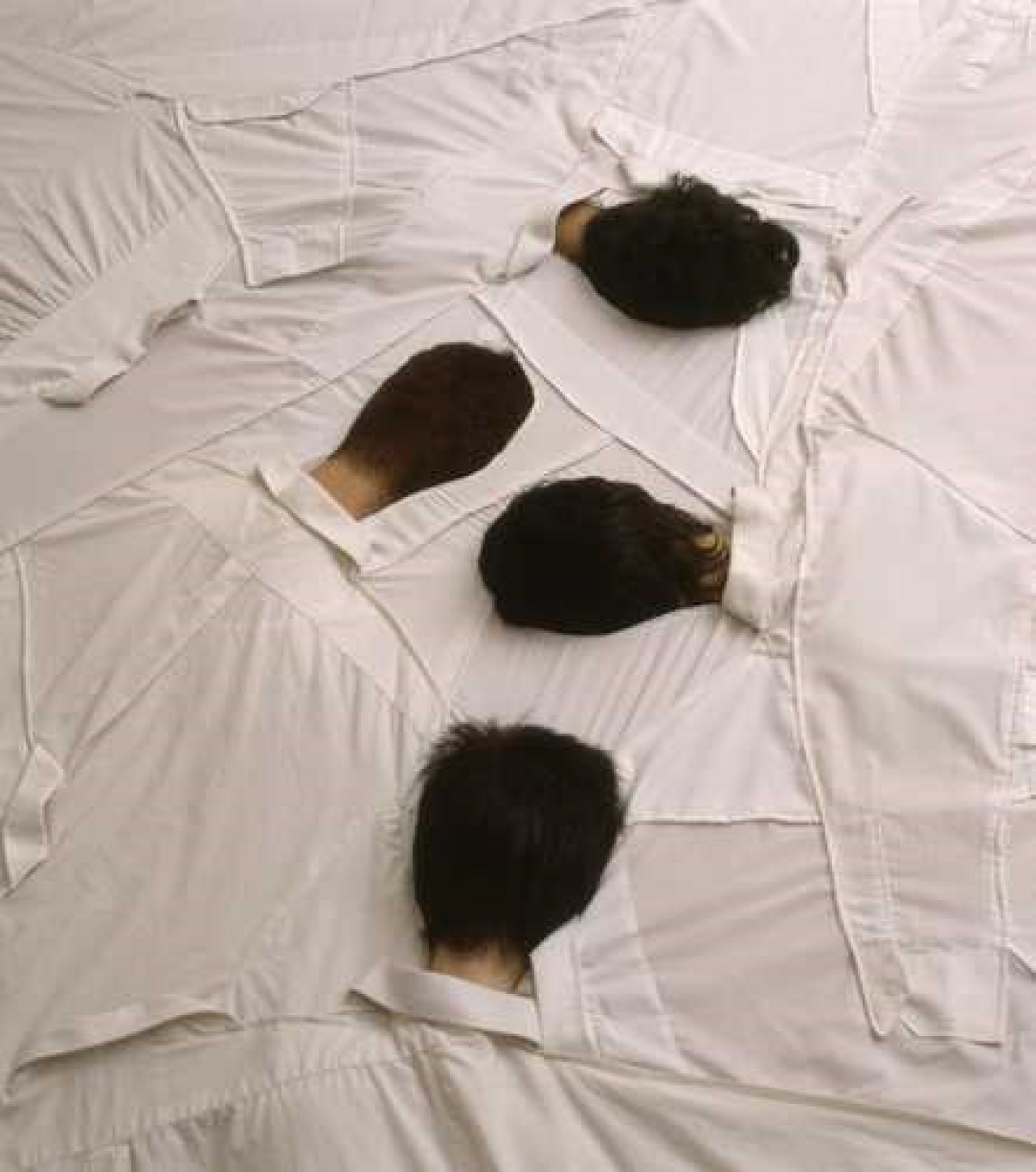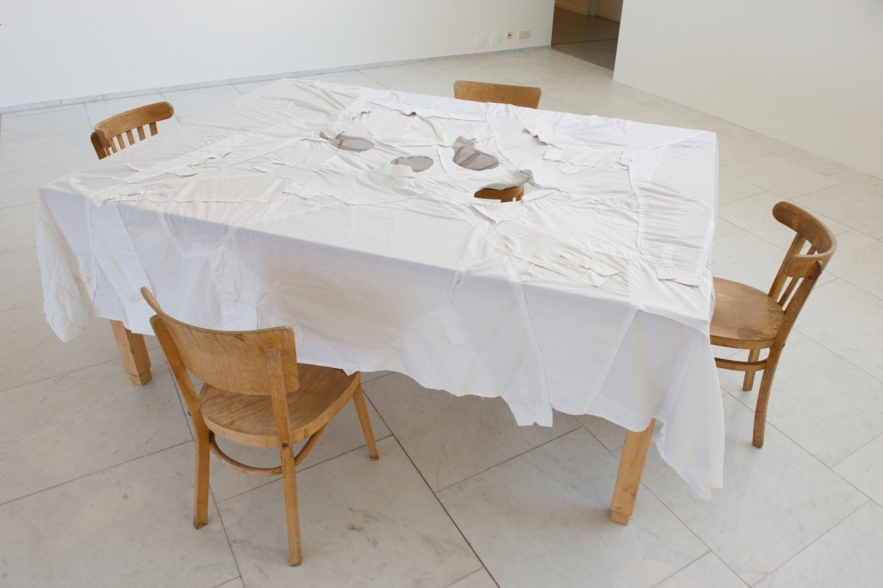 De installatie ‘Table’ bestaat uit een tafel met daaromheen vier lege stoelen en vier harige objecten die zich in het midden van het tafelblad bevinden. Als borstelige eieren liggen zij op tafel, wat een ietwat verontrustend beeld oplevert. Zeker wanneer je de smetteloos wit bedekte tafel associeert met bijvoorbeeld een uitgebreide Paasbrunch, omgeven door familie en vrienden. Net als deze brunch vraagt het werk ‘Table’ om meer tijd en aandacht. De ware aard van het werk toont zich alleen wanneer deze zorgvuldig en nauwkeurig wordt onderzocht door de toeschouwer en het zal opvallen dat het tafelkleed hier en daar sporadisch een tikkeltje lijkt te bewegen. De beweging volgend met het oog, is deze afkomstig van de harige eieren die onverwachts blijken te leven. Het zijn vier achterhoofden die bij iedere ademhaling op en neer gaan, veilig verborgen onder het tafelkleed dat is gemaakt van aan elkaar genaaide witte overhemden. Het tafelblad lijkt hen te hebben opgeslokt en de vier personen nemen geen plaats aan tafel, maar zijn -onderdeel geworden van- de tafel. Het moment is echt toegeëigend.