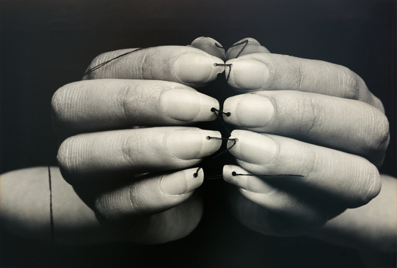 Dit ongemak komt uitermate tot zijn recht in Davids fotoreeks ‘Thread’. In deze serie zwart wit foto’s zien we in elk van de individuele beelden een paar handen met hiertussen draad. In eerste instantie ogen ze kalm; de handen zijn niet in staat van uiterste inspanning, maar lijken vastgelegd op een moment van vrije, beheerste beweging. Ze beschikken over een zekere gratie, tot er duidelijk wordt dat de draad is bevestigd door kleine gaatjes in de nagels van de handen. Deze gaatjes moeten door de mens gemaakt zijn; geboord, weggeslepen of wellicht zelfs geperforeerd. Door het idee alleen al, springen nekharen overeind en dan is er nog niet gesproken over het gevoel van gevangenschap dat bij deze handeling komt kijken. De realisatie dat deze handen letterlijk aan elkaar vastgenaaid zijn doet rillen.