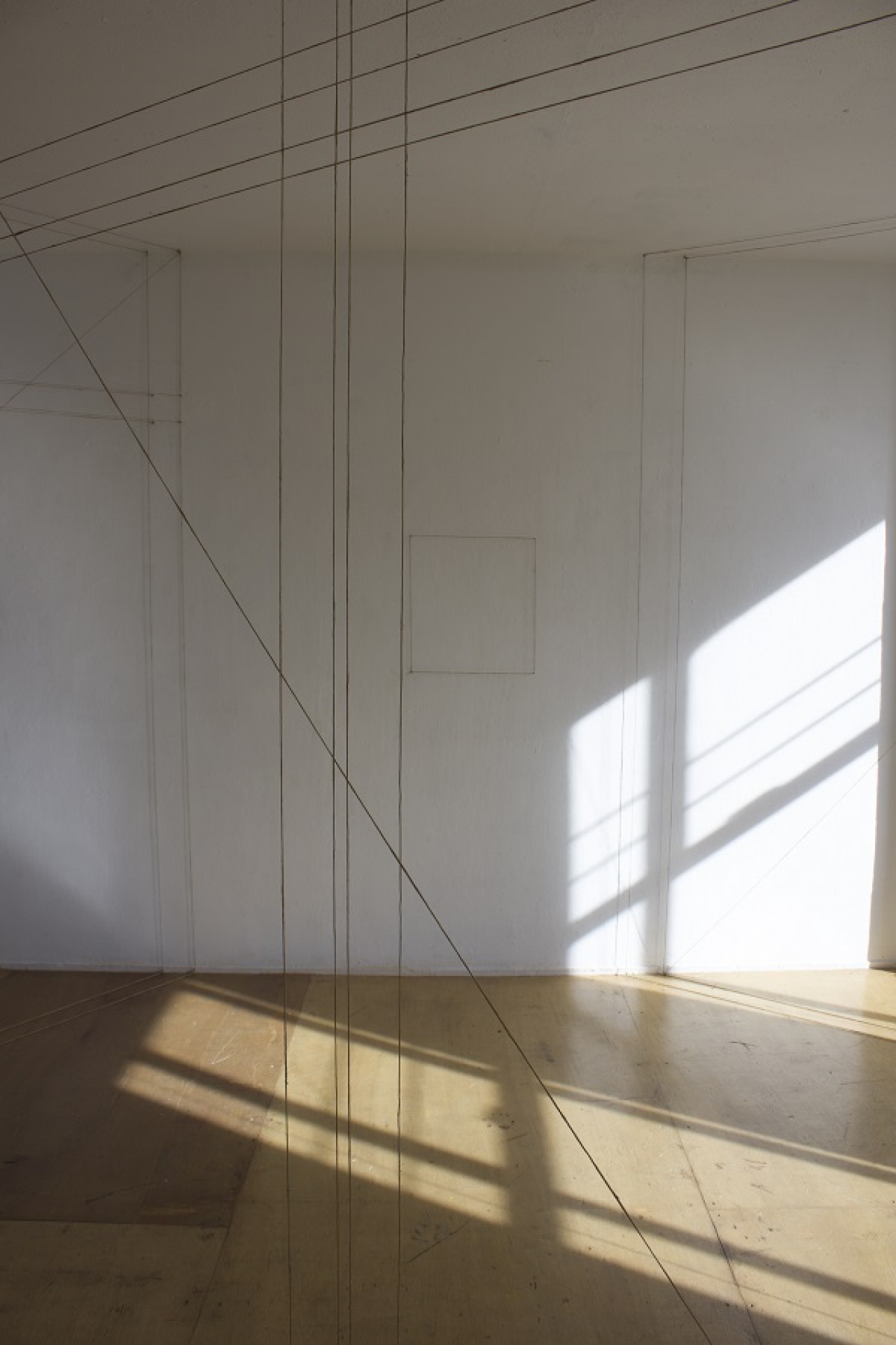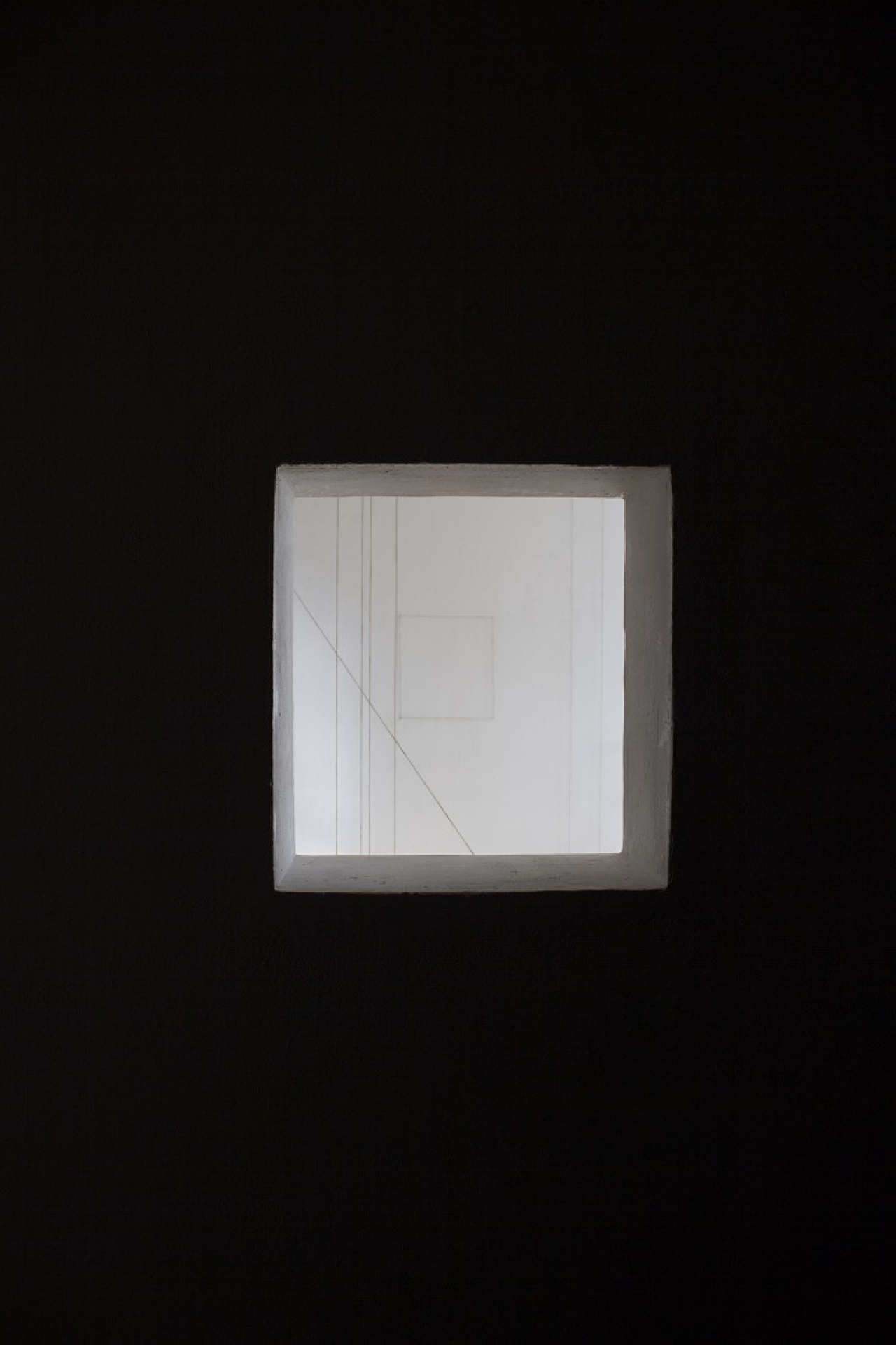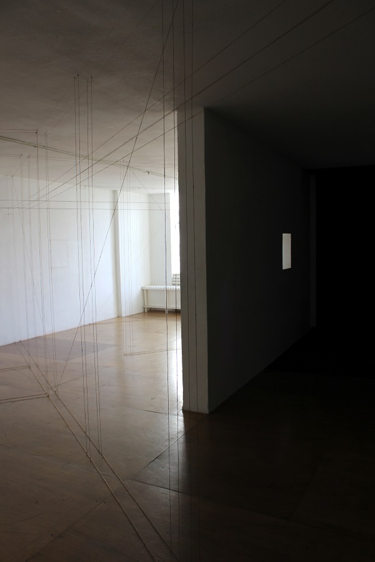In de muur zit een vierkant doorkijkje waardoor de helder witte muur die hier evenredig aanloopt fel afsteekt. Op de wand is met touw een vierkant op dezelfde hoogte aangebracht. In het gedeelte van de zaal bij binnenkomst is aan de rechterkant een deel van de muren, plafond en vloer bedekt met pikzwarte stof. Tegen de witte expositiemuren steekt dit gedeelte vervreemdend af. De diepe zwarte kleur geeft een oneindige afstand in de ruimte, ik moet denken aan Anish Kapoor en zijn Descent into Limbo, waarbij een zwarte cirkel op de vloer een oneindig gat lijkt.