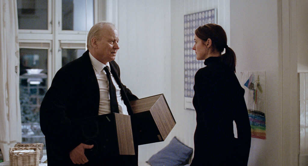De shots in Sentimental Value zijn prachtig, evenals het licht. Schilderachtig bijna. Ook dat roept het werk van Hammershøi en Dodd in herinnering. Toch vond ik Sentimental Value geen makkelijke film om te kijken. Dat is positief bedoeld. In de film wordt de tijd genomen, zowel door de karakters, maar ook in de manier waarop de film gemonteerd is. Interacties worden vaak niet afgemaakt. Soms doordat het gesprek anders loopt, soms doordat iemand de kamer binnenkomt, soms door de keuzes die iemand maakt, soms doordat het leven beslist. Voor een korte tijd is het scherm dan zwart, waarna het verhaal ergens anders verder gaat. Een harde ‘cut’. Dat de dingen tijd nodig hebben, dat het leven meandert, dat zie ik erin. De momenten dat het scherm even een paar tellen zwart is zijn als het beletselteken – […] – in een tekst, ze laten weten dat er iets weggelaten is. Het is eveneens een manier om het verstrijken van tijd in beeld te brengen, en dat is prettig om te zien want vaak ‘verdwijnt’ de tijd uit een eindproduct. In die zin dat we wel weten van de tijd, maar ‘m niet echt voelen.