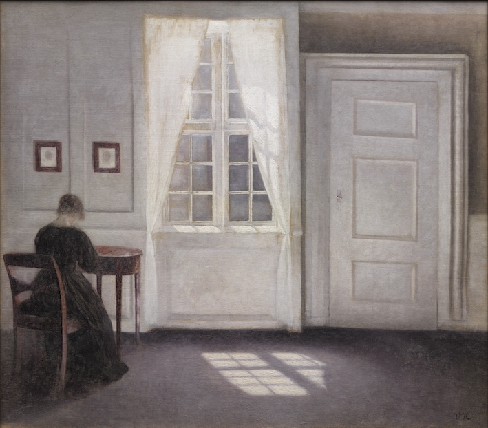 Dit jaar zag ik niet eerder zoveel schilderijen van de Deense schilder Vilhelm Hammershøi (1864-1916), wiens werk ik al lang bewonder vanwege de ingetogenheid. Zijn kleurpalet is vergrijsd, bestaat uit morsige blauwen. Het licht is een stemming op zich. Hammershøi schildert meestal een persoon, gezien op de rug, in een ruimte, en in hetzelfde werk een doorkijkje naar een ander vertrek, of een venster. Soms is het geen persoon maar een object dat we te zien krijgen, zoals in het veelzeggende Interior with the Artist’s Easel (1910).