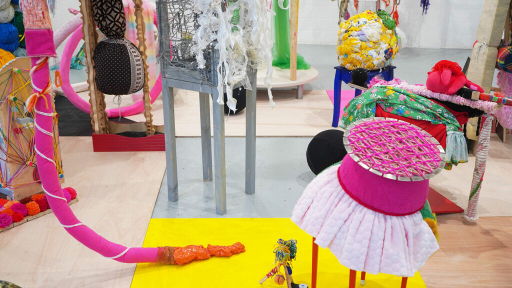 Marja van Putten is in de eerste plaats een schilder, een fundamentele schilder zelfs, die in een vast raster van negen vakken op haar doeken systematisch juist visuele ordening ondermijnt. Toch bestond haar recente presentatie femmeBRUT 3D in november 2024 in kunstruimte de Bouwput aan de Ferdinand Huykstraat in Amsterdam-West – met als motto Anarchy in a white cube – uit een sculpturale installatie. In een bont gekleurd geheel figureerden daar in textiel en andere materialen uitgevoerde gestalten, die met elkaar een gevarieerde menigte vormden die je doorgaans aantreft op een drukke marktdag op de Albert Cuyp. De theatrale setting gaf me als bezoeker het idee dat ik met mezelf werd geconfronteerd in een situatie die ik weliswaar zelf had gekozen maar waaraan ik tegen alle verwachtingen in ondergeschikt werd gemaakt; alsof ik als concertgebouwbezoeker in een massa pogoënde punkers terecht was gekomen.