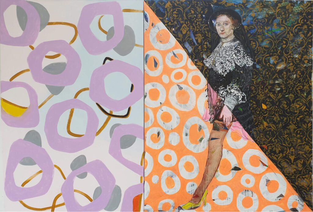 ‘In feite ondergraaft het systeem zichzelf. Het implodeert. Ik word daardoor op mezelf teruggeworpen vanuit de vraag wie ik ben en wat ik doe. Ik heb er veel toepassingen aan gegeven, in abstracte schilderijen, maar ook in kunstenaarsboeken. Het is voor mij een codering, juist om aan de codering te ontkomen en te streven naar openheid, progressie. Door steeds weer op te staan verzet ik me tegen het neerdrukken. Door zo te schilderen verbaas ik mezelf: wat is er nu weer ontstaan, wat heb ik nu weer gedaan, waar komt het vandaan? Zo maak ik steeds sterker en extremer werk. In 2022 heb ik een grote tentoonstelling gemaakt in Loods 6 in Amsterdam. Dat was de eerste femmeBRUT tentoonstelling, grote doeken van twee bij twee meter gemaakt met textiel en af en toe wat verf.’