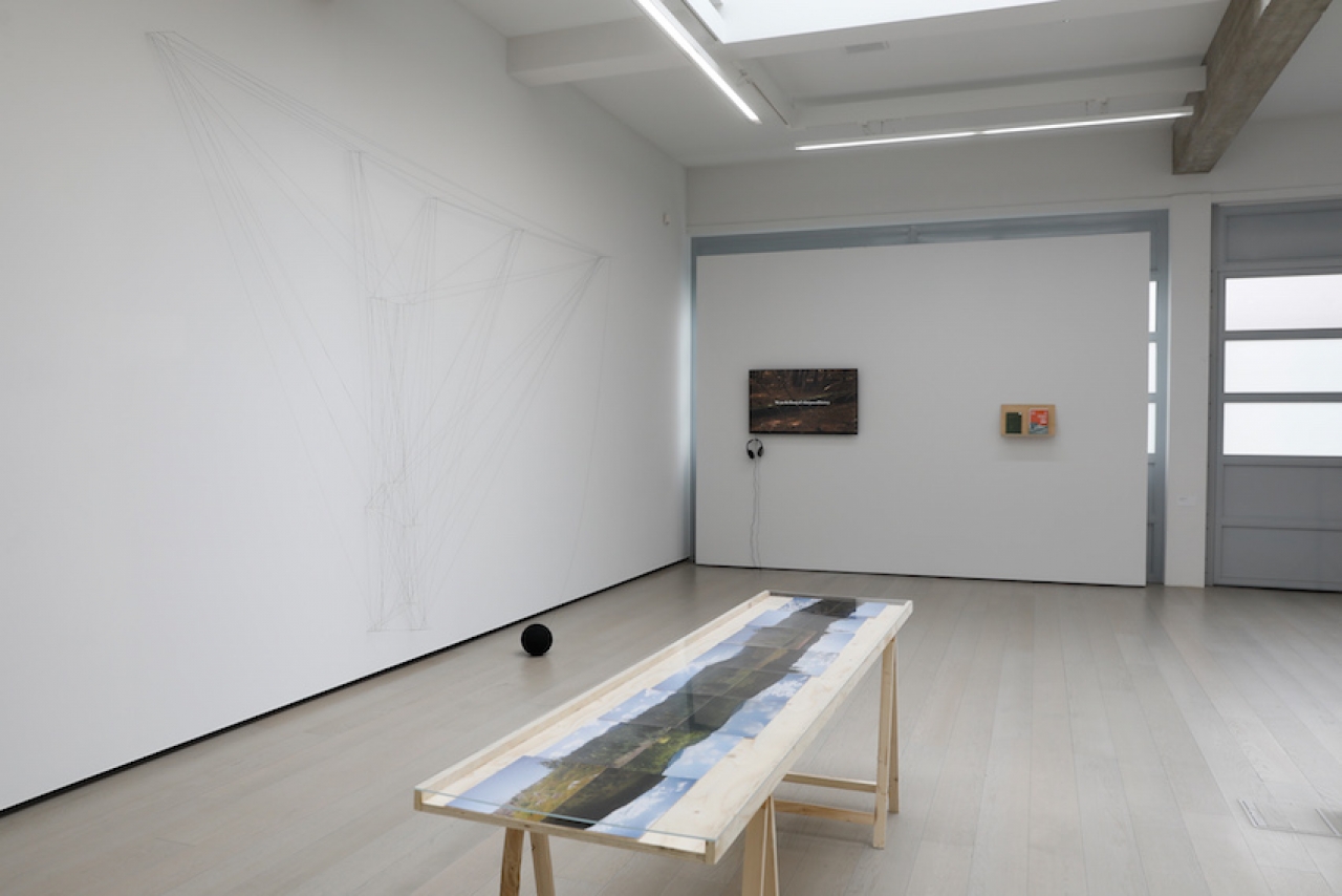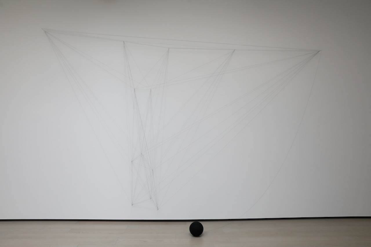 In een ander facet van het kunstwerk brengt Bonilla de routes van de herten in kaart door middel van een dun zwart draad dat schematisch en strak op de muur is gespannen, en waarvan het uiteinde van de draad overgaat in een nog niet volledig afgewonden bol op de vloer. Het suggereert maakbaarheid; menselijk handelen vormt buiten ons blikveld om het gedrag van dieren hun habitat. Als je de metafoor van de draden ver genoeg doortrekt zijn de gebaande paden van de herten terug te voeren op stiksels op een planeet die de mensheid als hun lappendeken beschouwt.