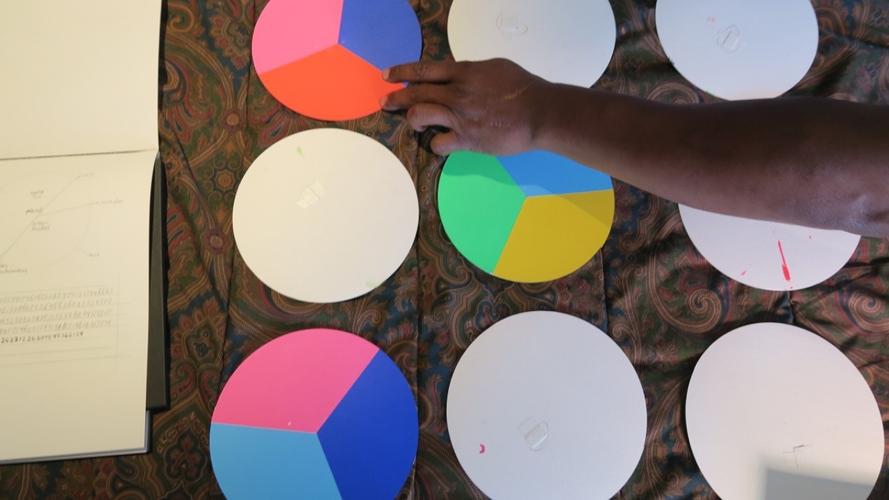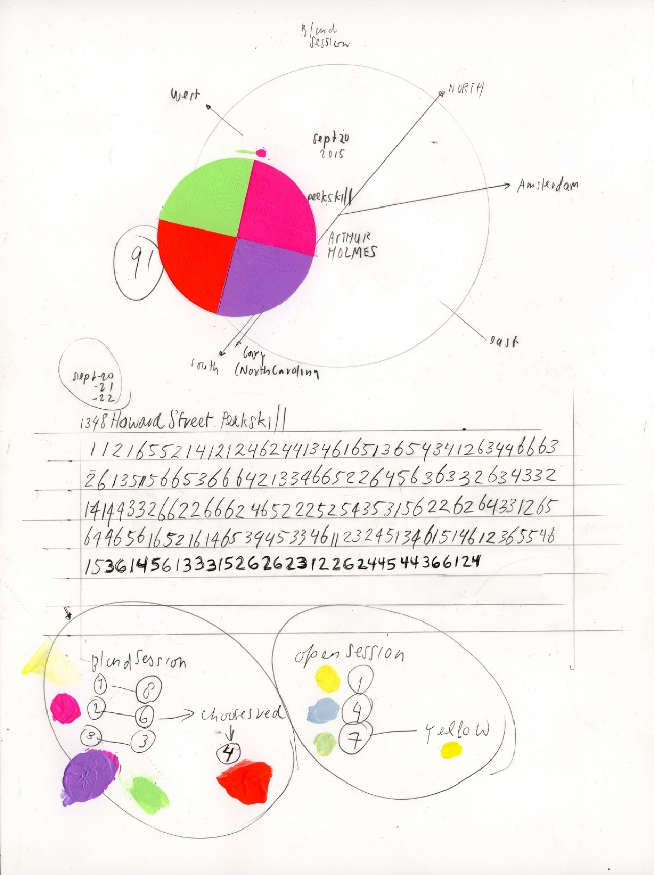 We’ve set out the dice, colour circles, paint and brushes on the bed. We spent more than three concentrated hours for the whole process of throwing dice and choosing colours blindly and noting down the results.
