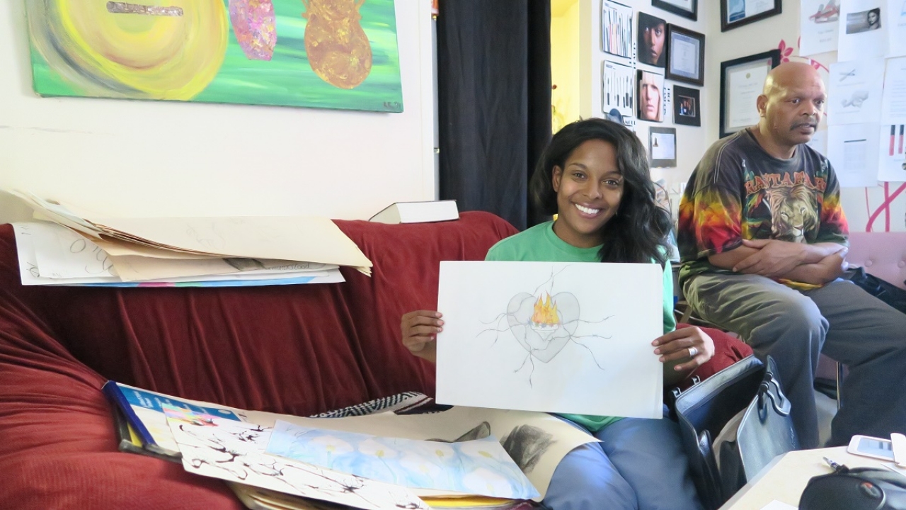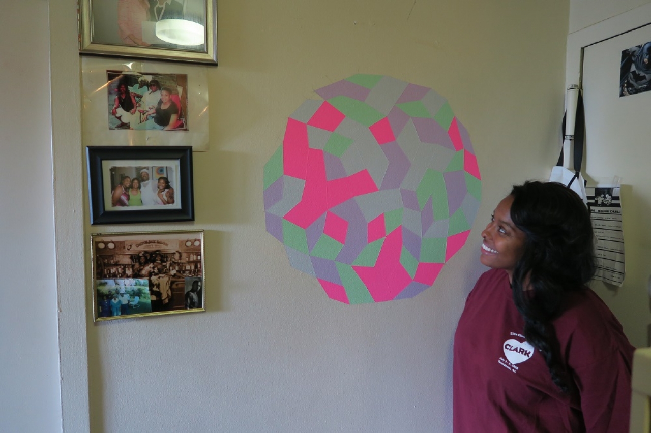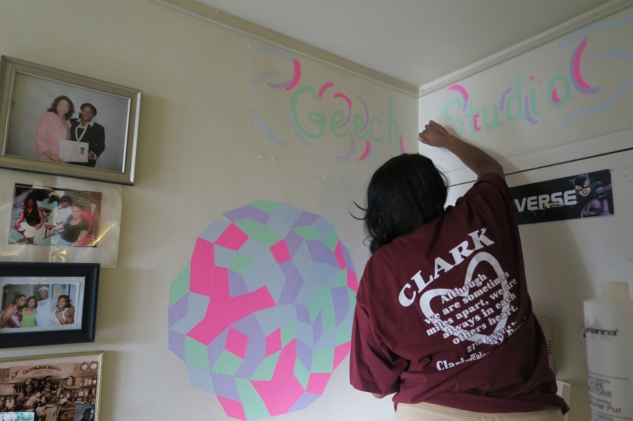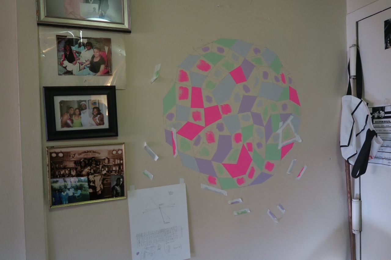 Today we’re painting in Bohlmann Towers for the first time, at Mishiba’s apartment. Her friends Emerson and Maureen, who are both going to get a wall painting, are also present. And their pastor is there, because he temporarily has no place of his own and is sleeping on the couch. Today they’re having their weekly Bible study session at Mishiba’s place. There’s just enough room for us and the mood is convivial. It’s Wednesday, so we’re eating pies and pastries from the Kiley Center.