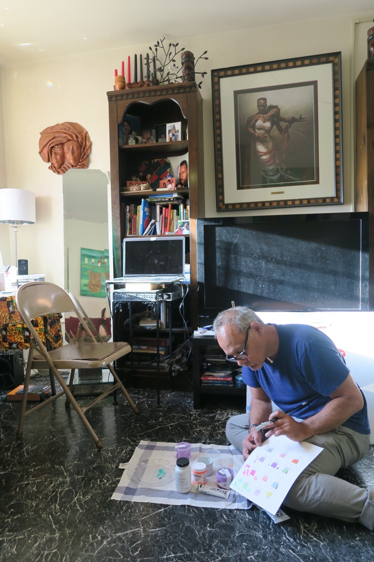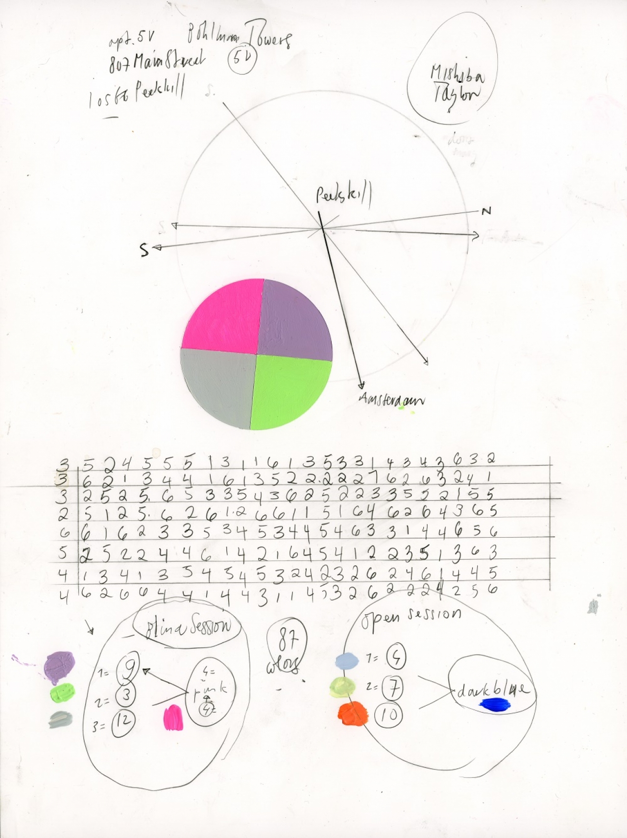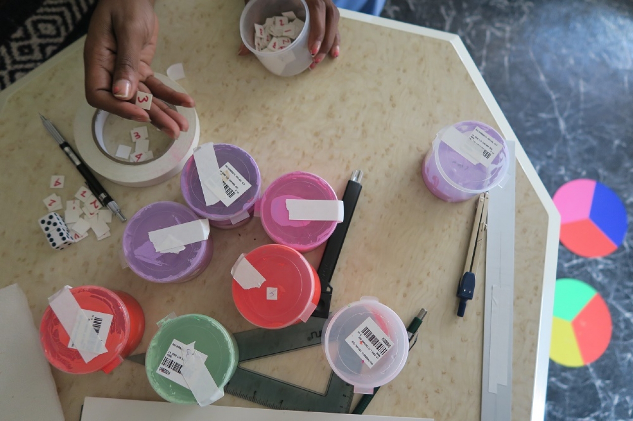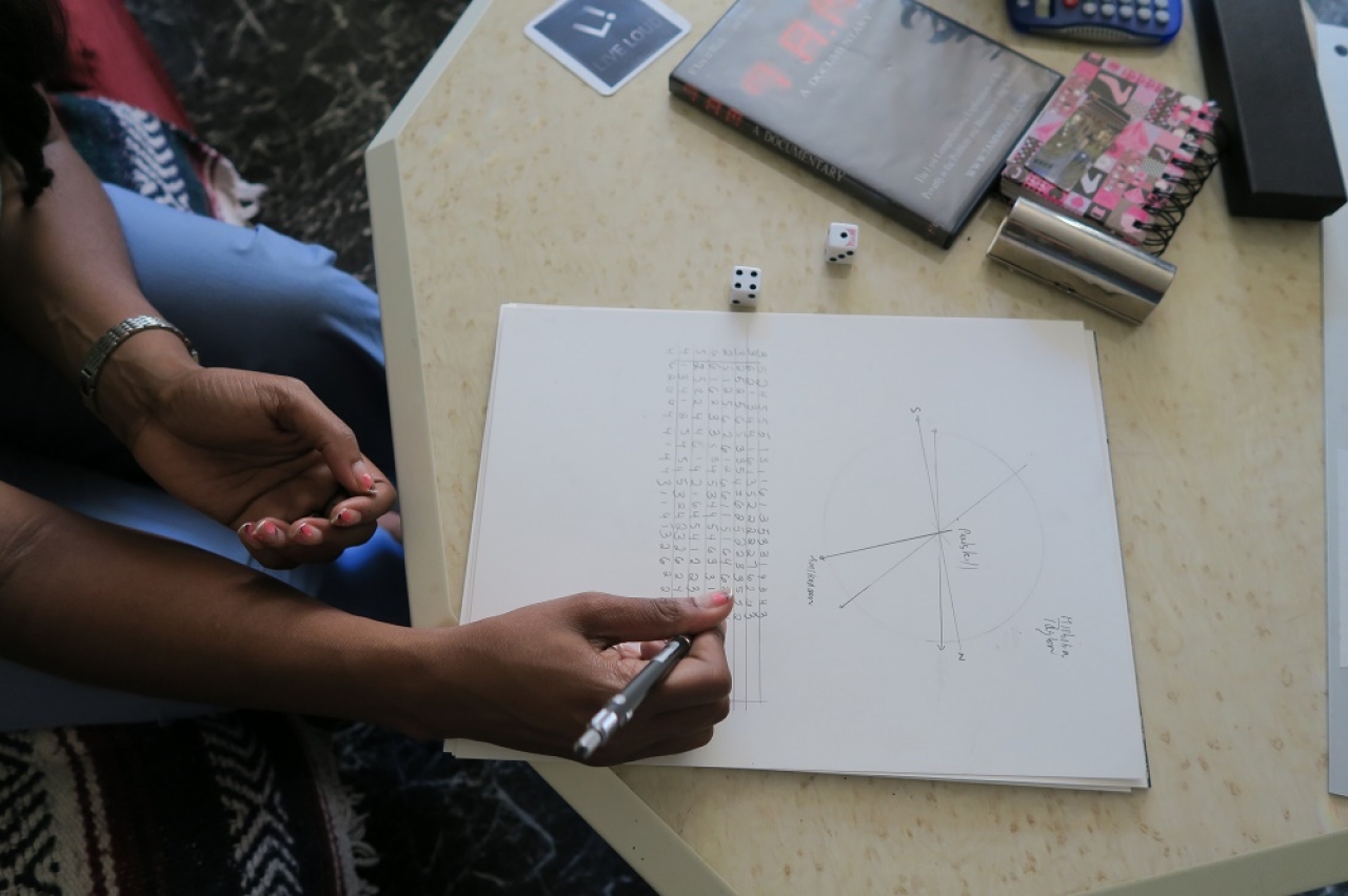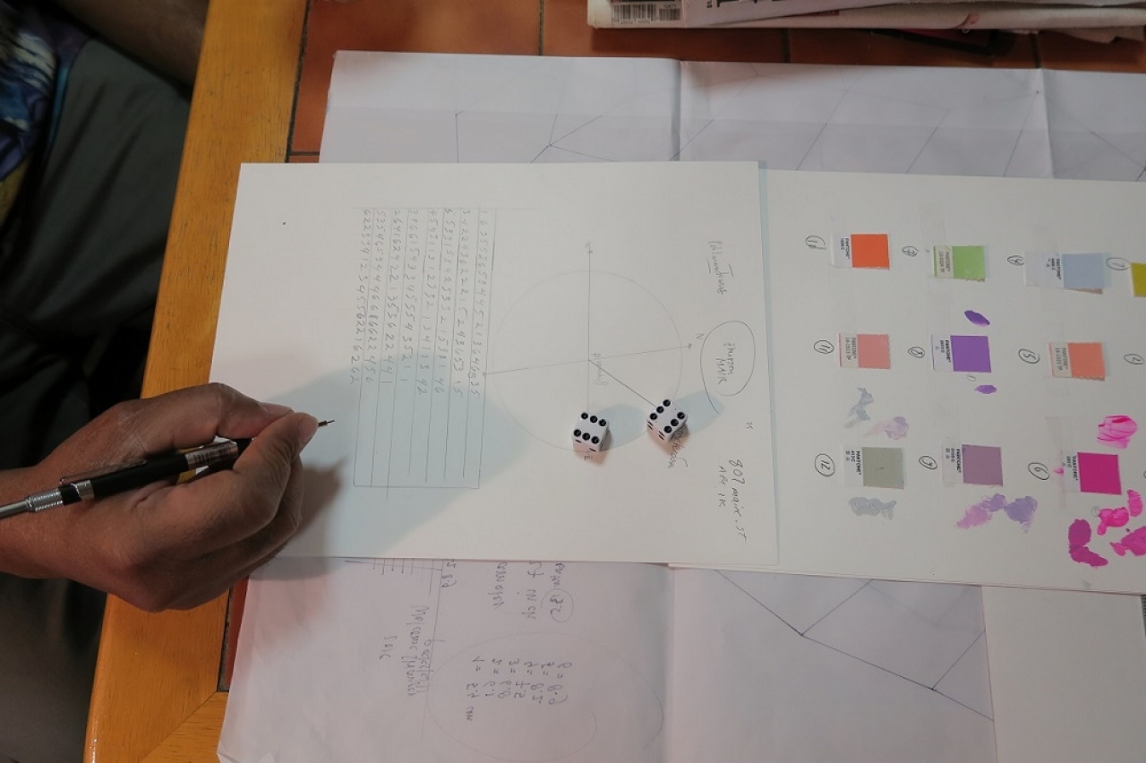 I still believe that everything that is heard or happens in the room while throwing the dice influences the painting. I reckon that’s auspicious here. While throwing dice and painting we listen to The Beatles, Jimi Hendrix, d’Angelo and Adele. We talk about politics, his time as a soldier, many serious topics, but we also laugh about plenty of things. And we have moments of shared emotion. It’s as if we’ve known each other for a very long time.