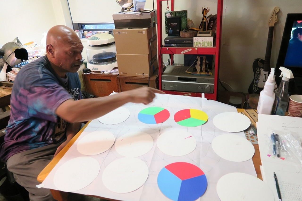 In the morning we apply the final layer of paint at Mishiba’s place and then we start in Emerson’s apartment, which is even more chock-a-block than Mishiba’s. His home is a museum and a workshop combined, a mix of everything: an electric guitar, a collection of caps, all kinds of tools, boxes full of videotapes, CDs, a Viking helmet, and loads of audio equipment. And also his kit from his time in the army, as Emerson is a veteran and as a soldier he used to work all over the world. He shows us his desert boots, as well as his collection of knives and torches.