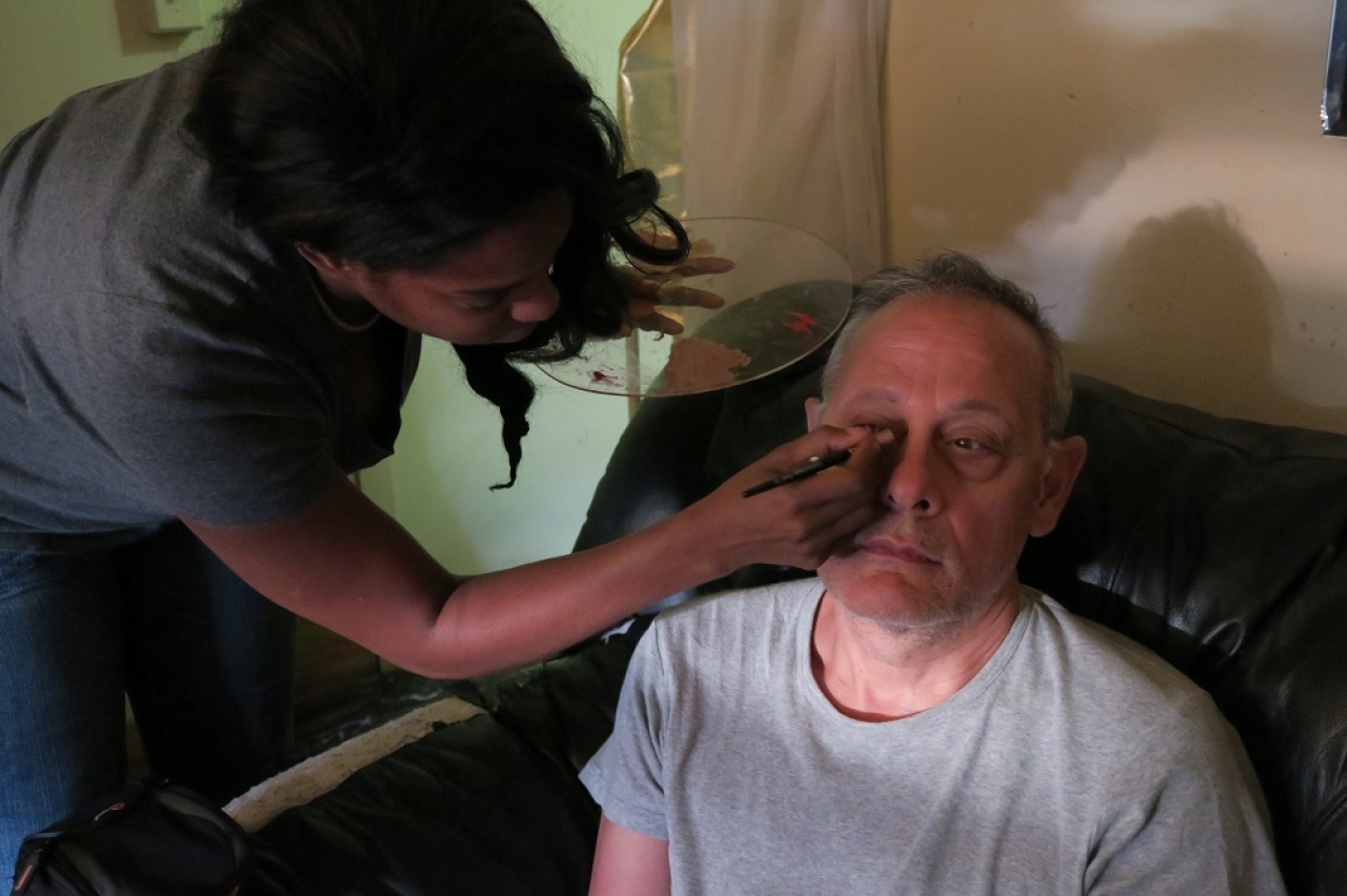 When George starts to mix his colours, she explains that she can mix any skin tone with her make-up kit. To demonstrate she mixes George’s skin tone in no time and uses it to camouflage the dark rings under his eyes. The colour is perfect. And because he doesn’t have any eyebrows, she swiftly pencils them in with an expert hand.