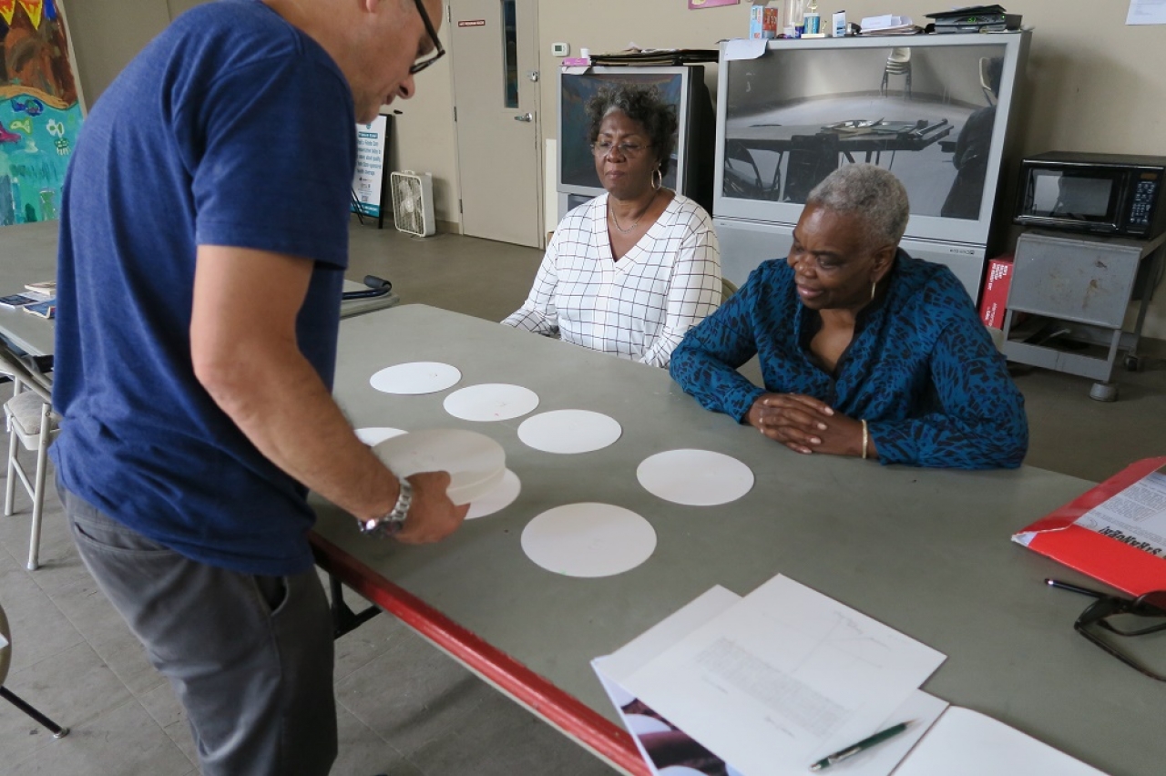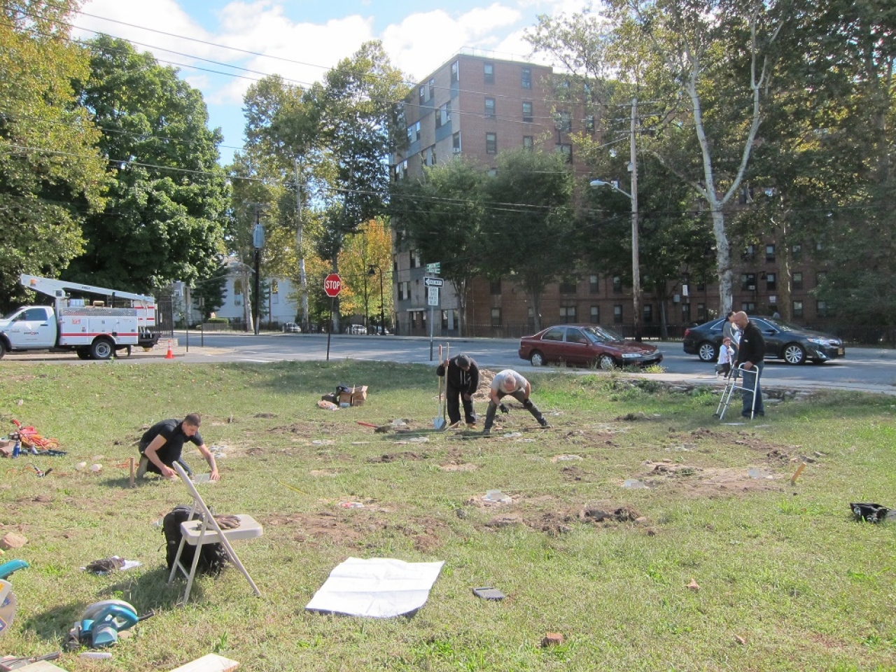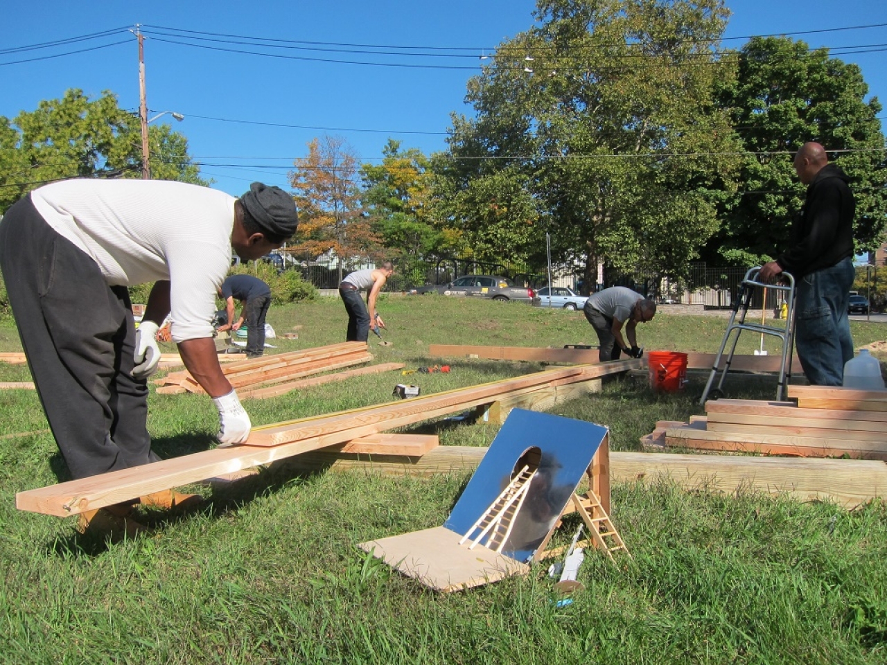 One passer-by seriously advises us not to put any art here; it would be better to set it on the banks of the Hudson River, with all the other sculptures. Nobody here is interested anyhow, and it’ll be destroyed or set alight. He’s certain of this, because he lived in Bohlmann Towers for years and is happy that he got away from here at last. And if we really want to continue, then we’ll have to watch out for ourselves and our things, and avoid coming here at night. Other people disagree with him. It’s time for change in this neighbourhood and art is something positive, especially as its being created together with the local residents and they will then be its lifelong stewards. Nowadays there are enough local residents who will keep an eye on things, right now and also later when it’s finished. Moreover, it’s unusual for two artists from the Netherlands to provide a free stage for the neighbourhood, so they’re happy about that. Except for the food from the foodbank they never get anything for free here.
