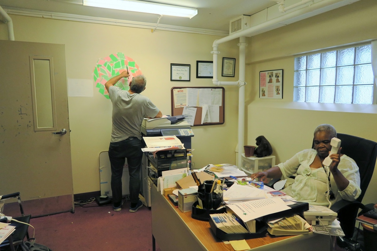 We start work on the painting in the Community Action Center’s office next to Bohlmann Towers, where Ms. Mary Rainey together with Ms. Doris Goodman are the community’s towers of strength and they are both devoted to helping those who need it most. And that is no small task: domestic violence, unemployment, drugs, poverty, criminality and racism are the norm here. Ms. Mary would like the painting in her office, primarily for the people who drop in for help every day. She has already cleared a spot above the photocopier.