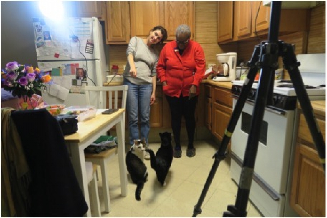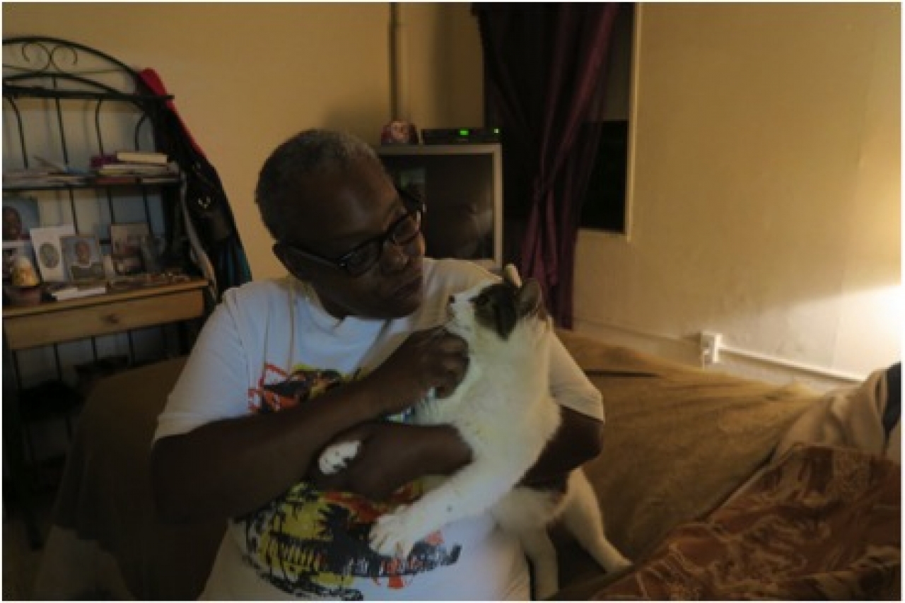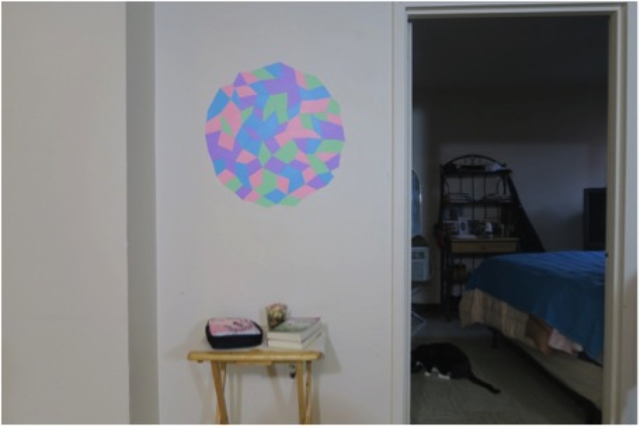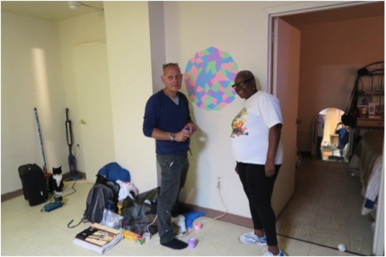 We’re busy working at Maureen’s apartment and this is the very last day of painting in Bohlmann Towers. We’ve enjoyed it so much that we think it’s a shame it’s coming to an end. At Maureen’s place we also feel hugely welcome. While throwing the dice and painting we eat papaya and she puts on gospel music for us. Her cats Jacky and Elvis purr as they sit there watching. The painting has a special significance for Maureen, who witnessed how it emerged throughout the process. As all the sections are different and unpredictable in their colour and shape, your eye cannot gain a grip and the panels of colour seem to escape repeatedly. Maureen identifies with the painting and feels that for her the message is: “Whatever happens, they can’t box me in.”
