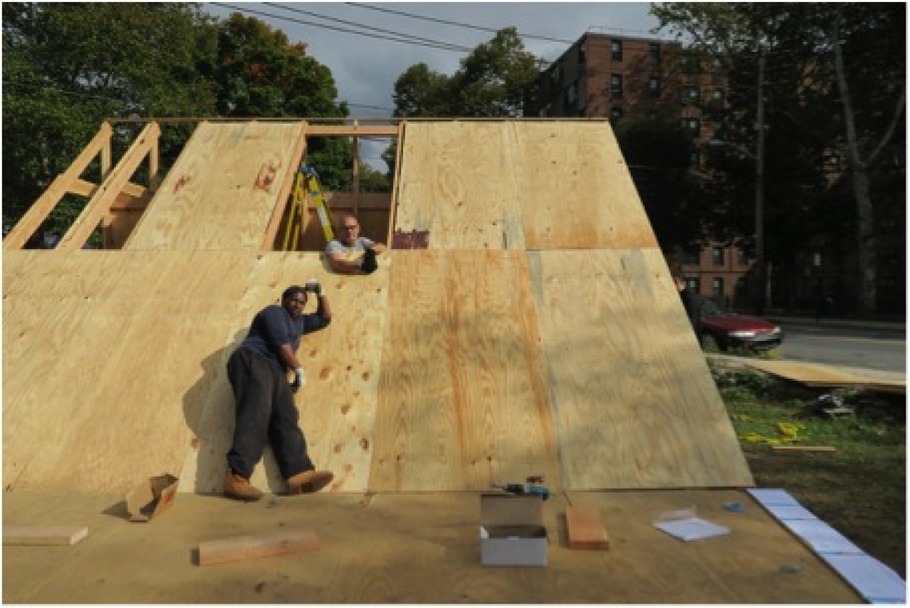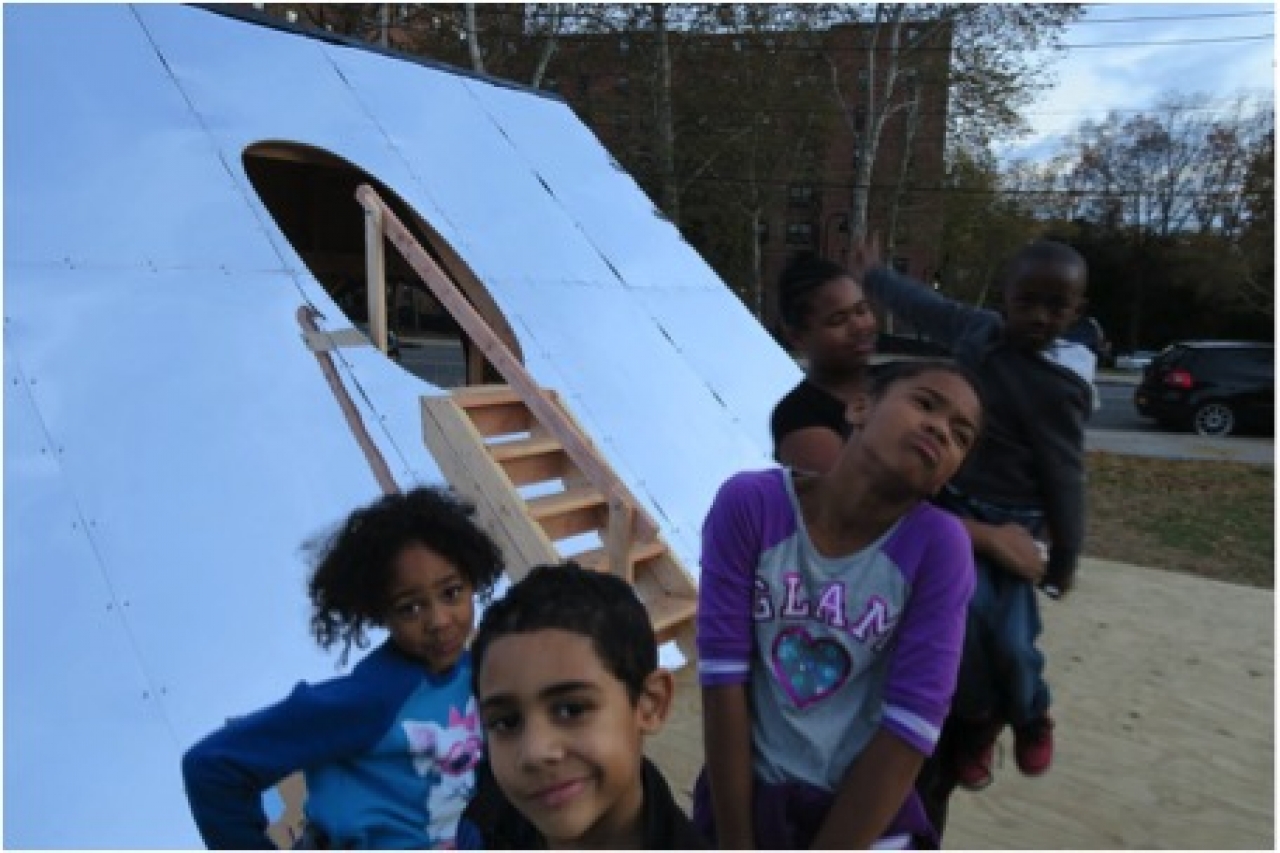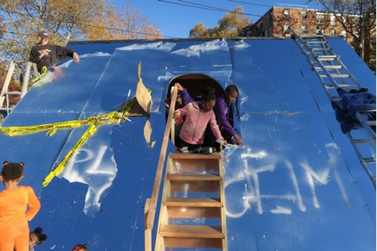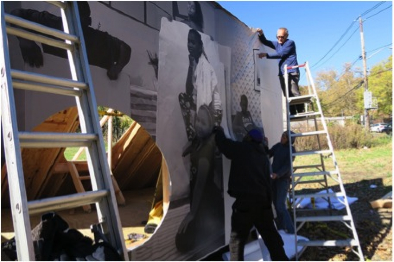Meanwhile in Peekskill, George is sawing two round holes as passageways through the structure and we complete the ‘safe house’. All we need to do now is paste the poster to the front. This was created by six youngsters from the Peekskill Youth Bureau, with our help. They were the first to react to our appeal on the flyers. In a four-day after-school workshop they created a ‘welcoming’ photo for passers-by with us. They feature in the photo themselves, standing like a reception committee on the Youth Bureau’s stage.