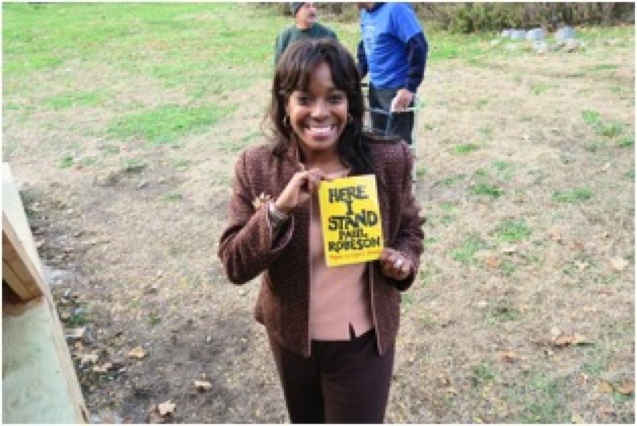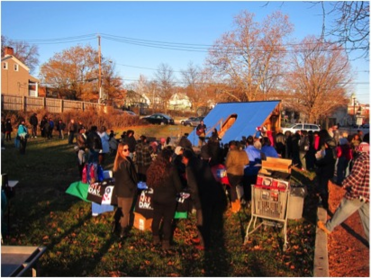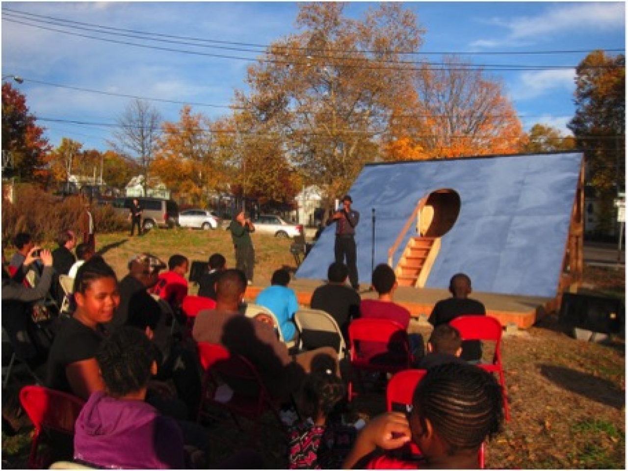 Meanwhile in Peekskill, George is sawing two round holes as passageways through the structure and we complete the ‘safe house’. All we need to do now is paste the poster to the front. This was created by six youngsters from the Peekskill Youth Bureau, with our help. They were the first to react to our appeal on the flyers. In a four-day after-school workshop they created a ‘welcoming’ photo for passers-by with us. They feature in the photo themselves, standing like a reception committee on the Youth Bureau’s stage.